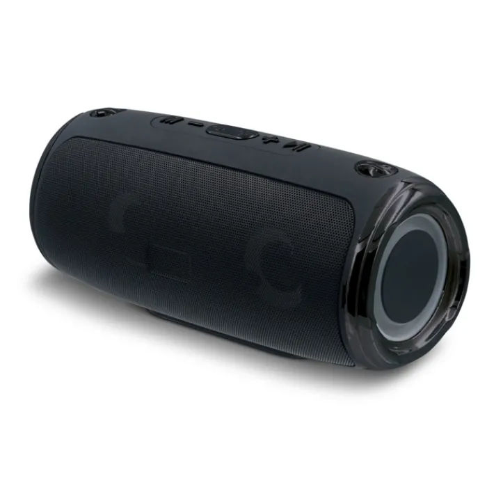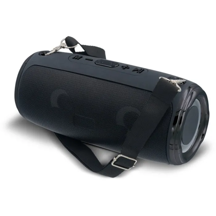 Altoparlante wireless V5.0 con tracolla regolabile. Entrata jack da 3,5 mm. Batteria agli ioni di litio da 3.600mAh. SNR: 85dB. Uscita: 2*10W. Frequenza: 20KHz. Riproduzione: 6h. Ingresso: 4,8V. Portata: 10m. Include un cavetto da 3,5mm per la ricarica con porta USB tipo C da collegare allo speaker e porta USB-A. Supporta le funzioni: Aux, scheda TF, FM e riproduzione tramite cavetto USB. Con una potenza di 20 Watt offre il massimo piacere di ascolto. L’aspetto lussuoso completa il prodotto e assicura che sia un vero e proprio eye-catcher per ogni occasione. Include manuale d’uso in: EN, NL, DE, FR, IT, ES, PL, FI, NO & SE