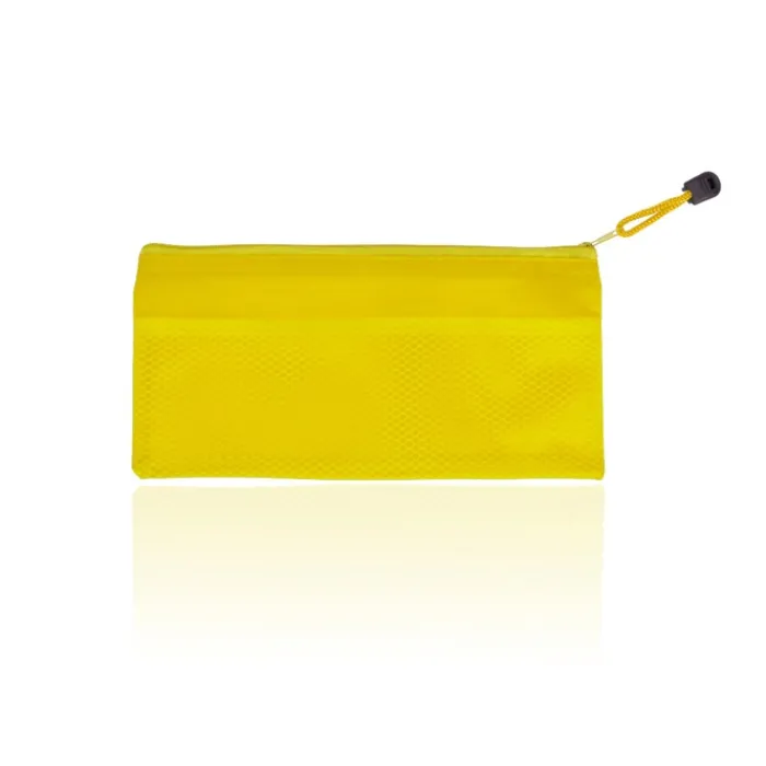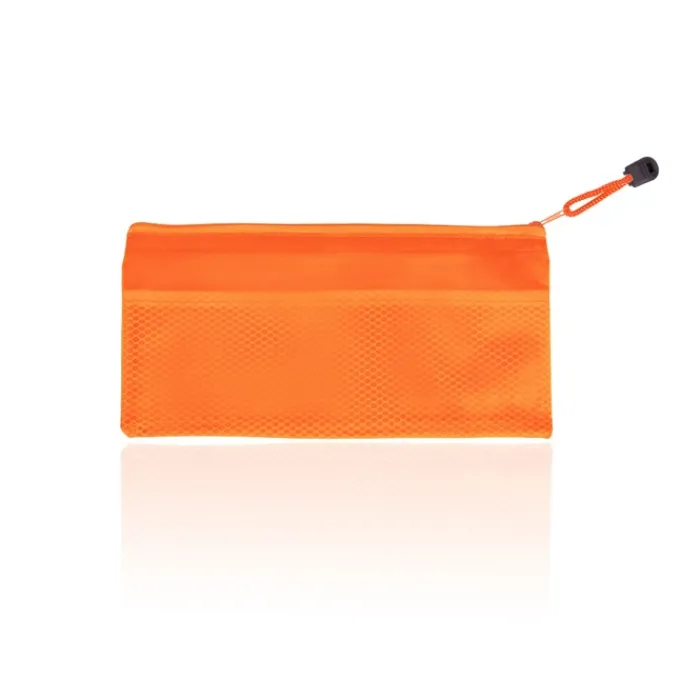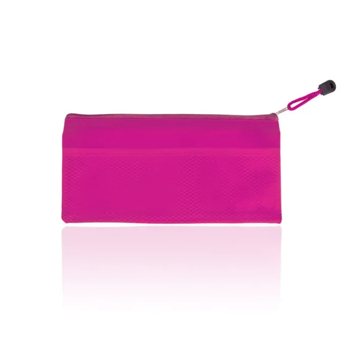 Astuccio con cerniera con un corpo morbido rifinito in PVC frost traslucido, disponibile in una vivida gamma di colori. Con nastrino tirante abbinato sulla maniglia della cerniera per una facile apertura.