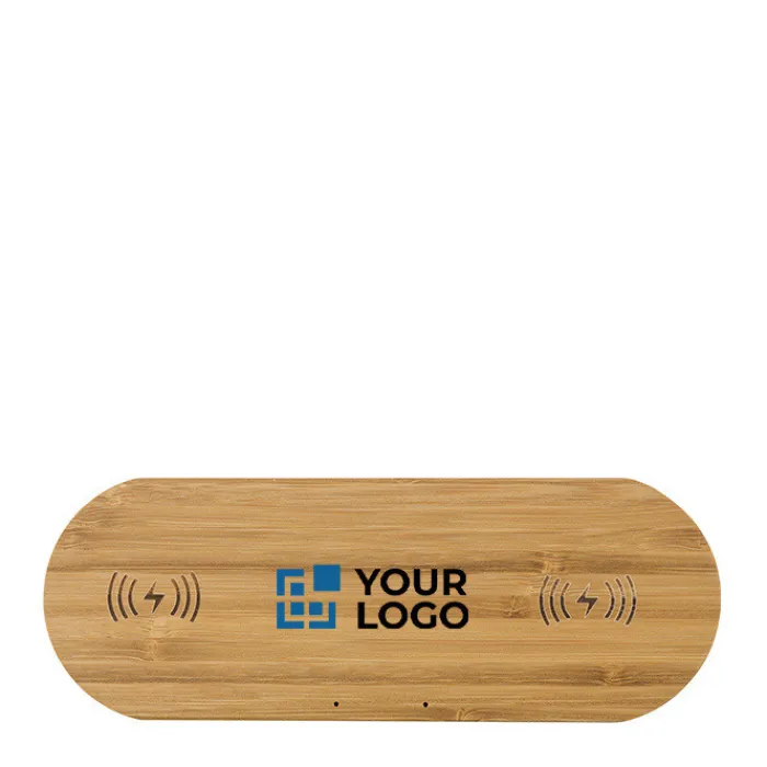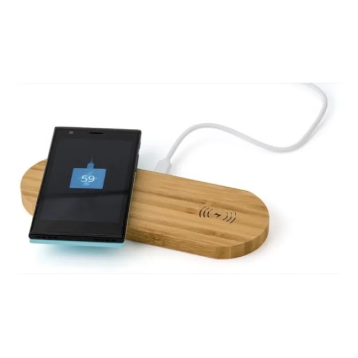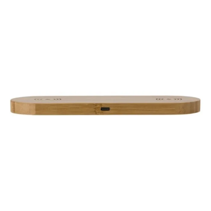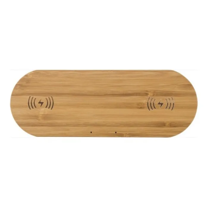 Caricatore wireless in bambù, con doppia posizione di ricarica. Cavetto incluso. Input DC 5V-3A, output 2x DC 5V / 1A. Adatto per la maggior parte dei device in commercio.