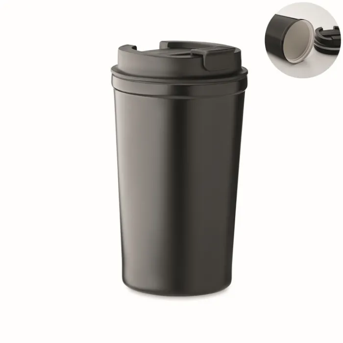 Bicchiere da asporto a doppia parete con isolamento sottovuoto in acciaio inox riciclato (90% acciaio inox riciclato e 10% acciaio inox) con rivestimento interno in ceramica. Tappo antifuga. Capacità: 450 ml.