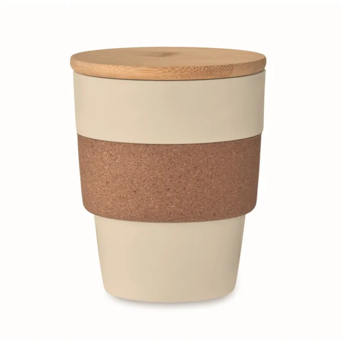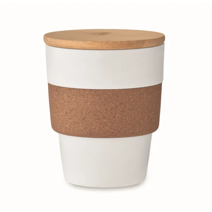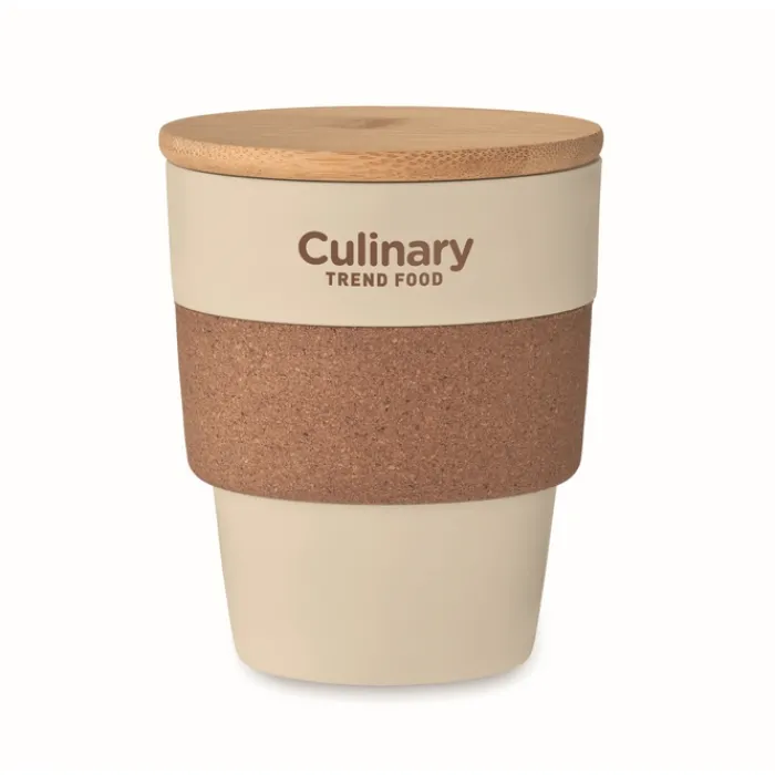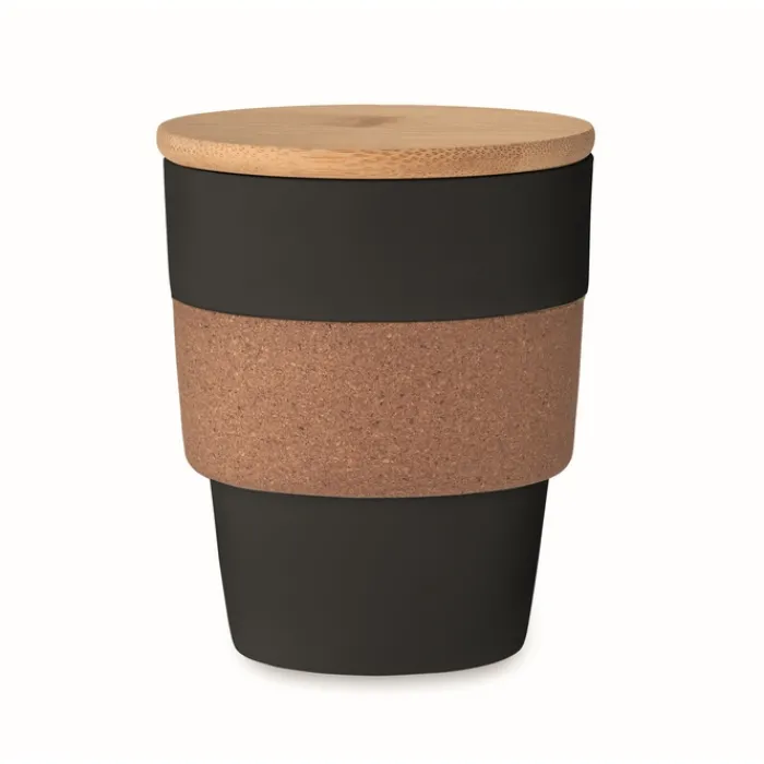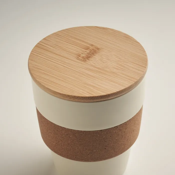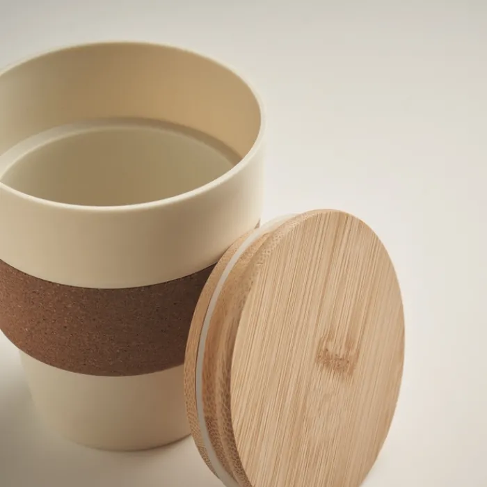 Bicchiere a parete singola in PP riciclato con fascia protettiva in sughero e tappo in bambù. Capacità: 300 ml. Poiché che una parete singola, il bicchiere potrebbe scaldarsi all’inserire bevande calde. Il bambù ed il sughero sono materiali naturali, per cui potrebbero esserci leggere variazioni di colore tra i vari bicchieri.