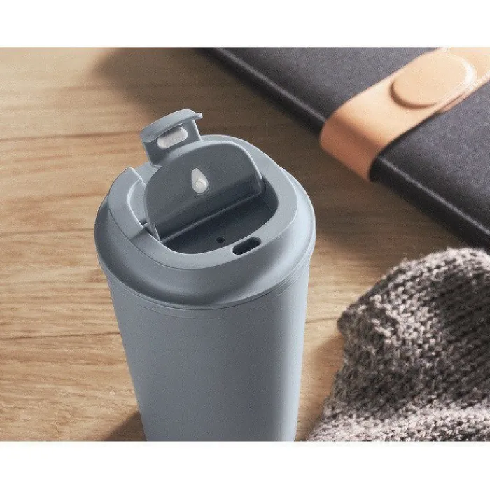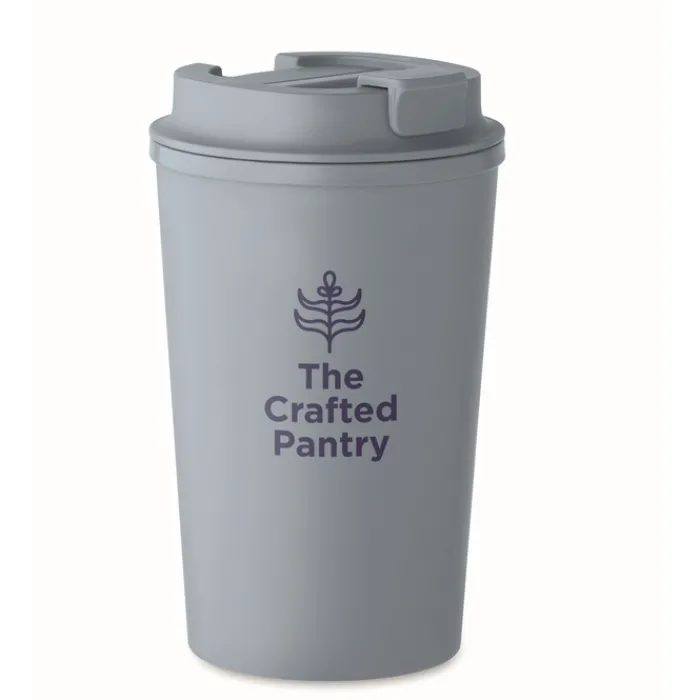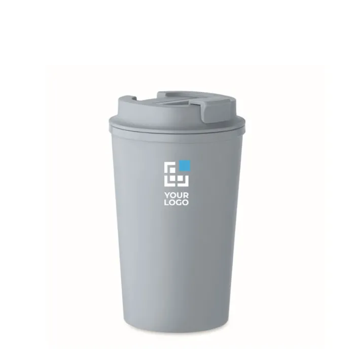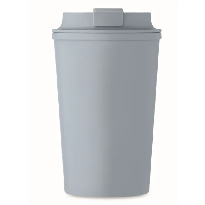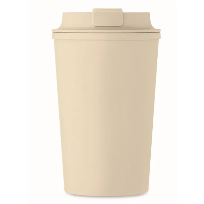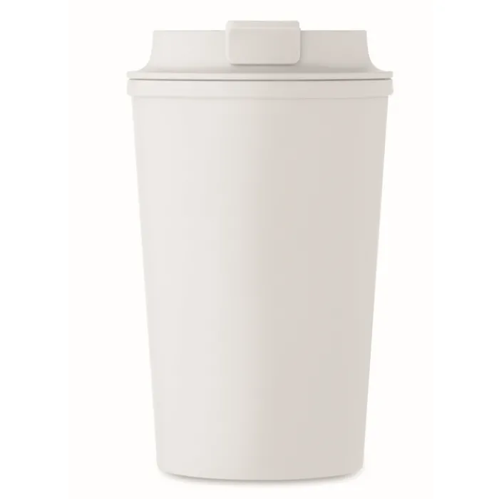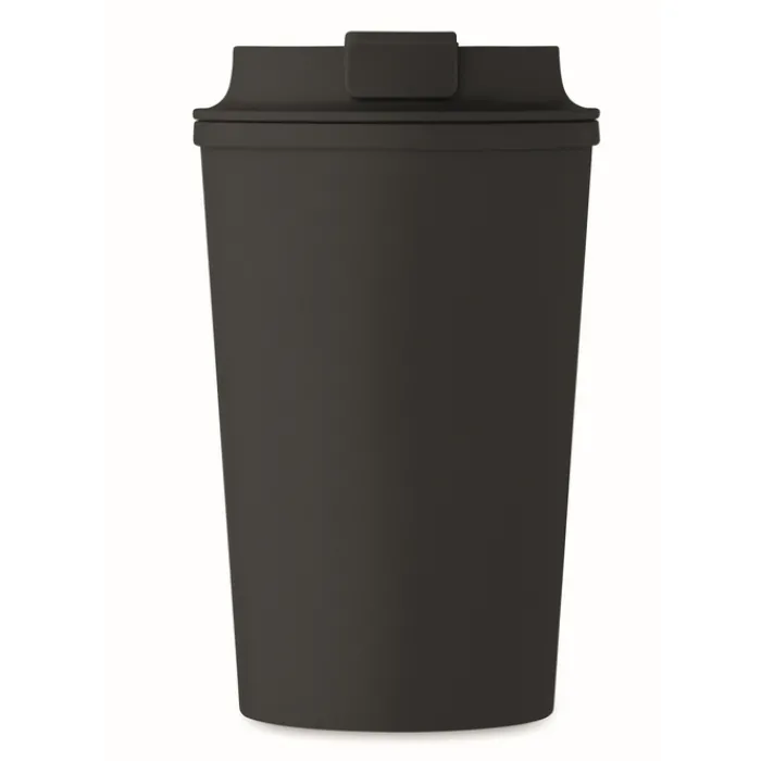 Bicchiere take away a doppia parete in PLA di mais con tappo per bere in PP riciclato con interno in TPR. Capacità: 350 ml.