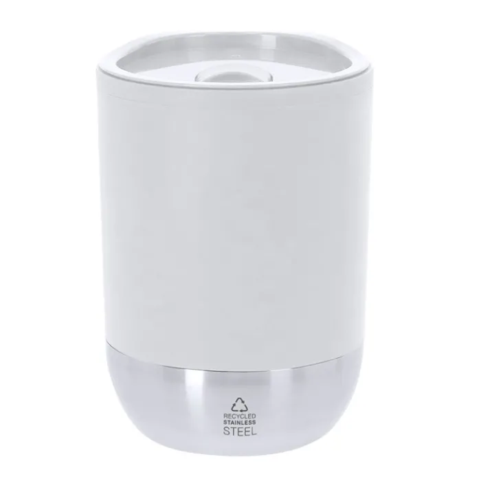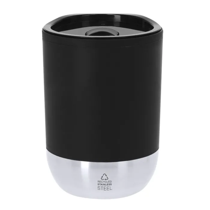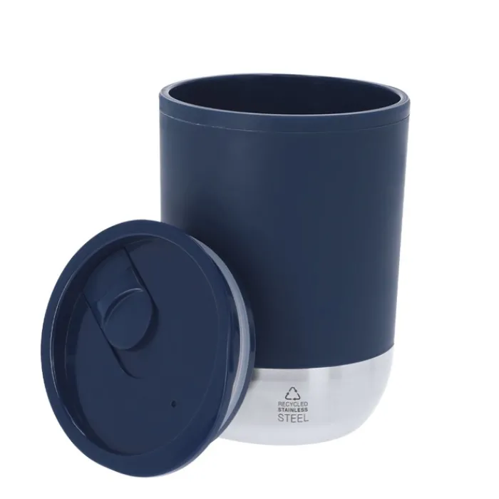 Bicchiere termico con una capacità di 290 ml. Realizzato in PP riciclato a doppia parete resistente, in combinazione con una base in acciaio inossidabile riciclato. Tappo di facile apertura con fessura scorrevole per poter bere, senza BPA. Certificato per uso alimentare, garantendo la sicurezza della bevanda quando entra in contatto con il materiale utilizzato per fabbricare il prodotto. Su un lato della base ha il logo dell’acciaio inossidabile riciclato. Il PP riciclato è una plastica riciclata e altamente riciclabile, altamente resistente e adatta a molteplici applicazioni. L’acciaio è uno dei materiali più ricercati e può essere trovato quasi ovunque, dai prodotti di uso quotidiano ai grandi edifici. Ha innumerevoli proprietà, tra cui durata e un alto grado di riutilizzabilità, rendendolo un’alternativa molto apprezzata per soluzioni sostenibili. Adeguatamente trattato, consente di ottenere nuove risorse di utilizzo infinito.