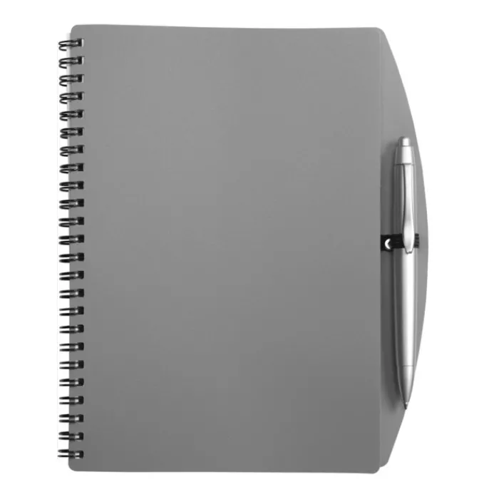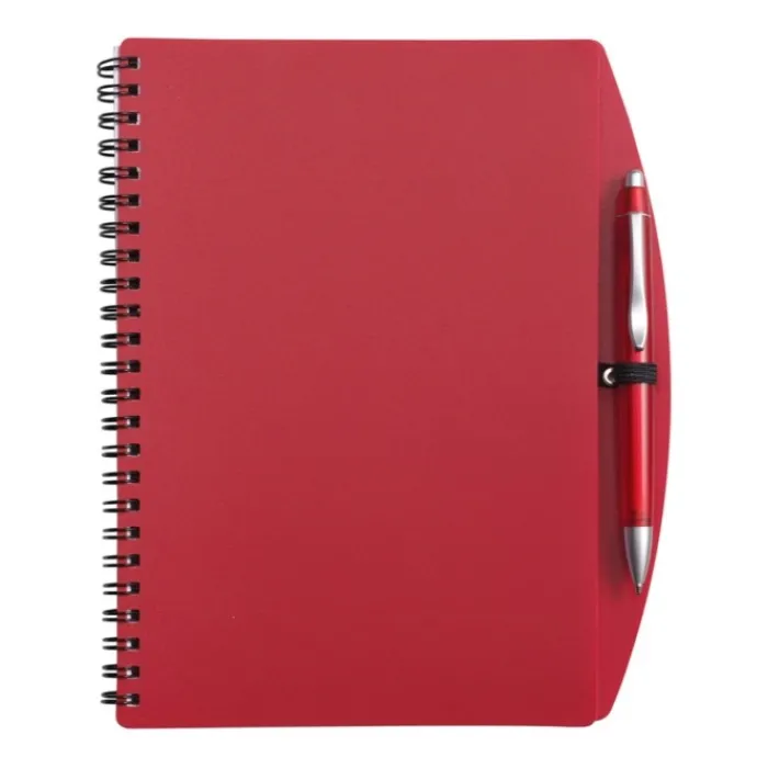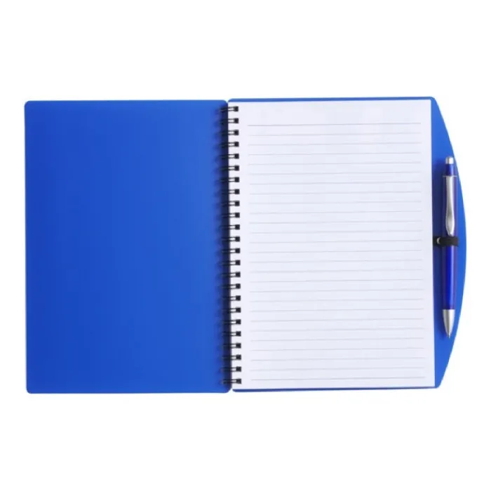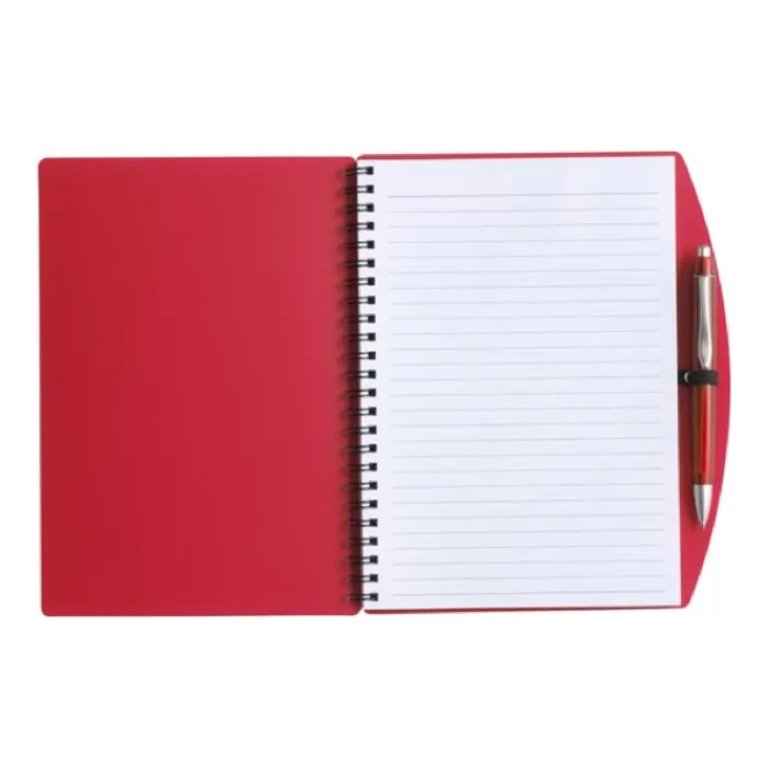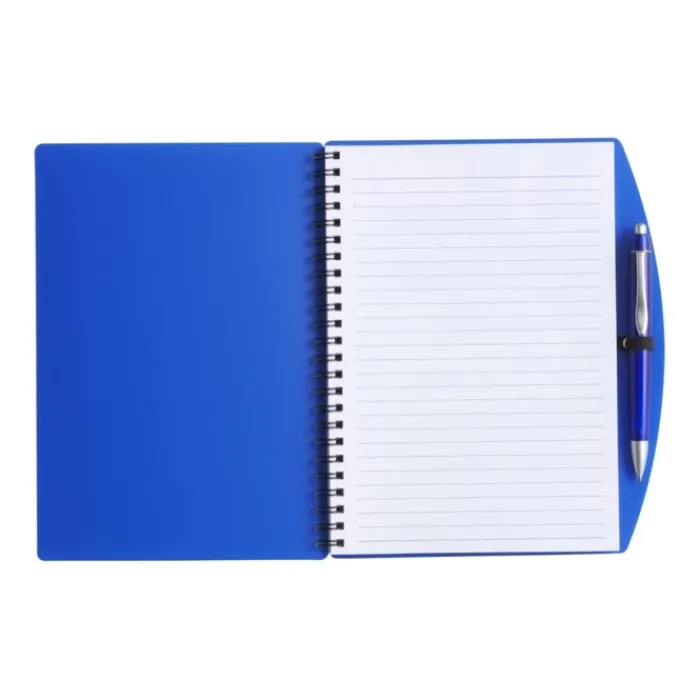 Block notes formato A5 con copertina in polipropilene (PP) e spirale laterale. Contiene 65 pagine a righe ed una penna a sfera colorata abbinata con clip in metallo ed inchiostro blu.