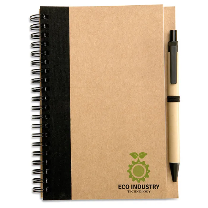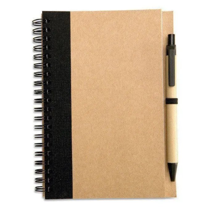 Notebook (70 fogli neutri) in carta riciclata con penna a sfera in cartone riciclato e parti in plastica biodegradabile. Refill blu.