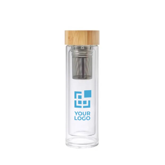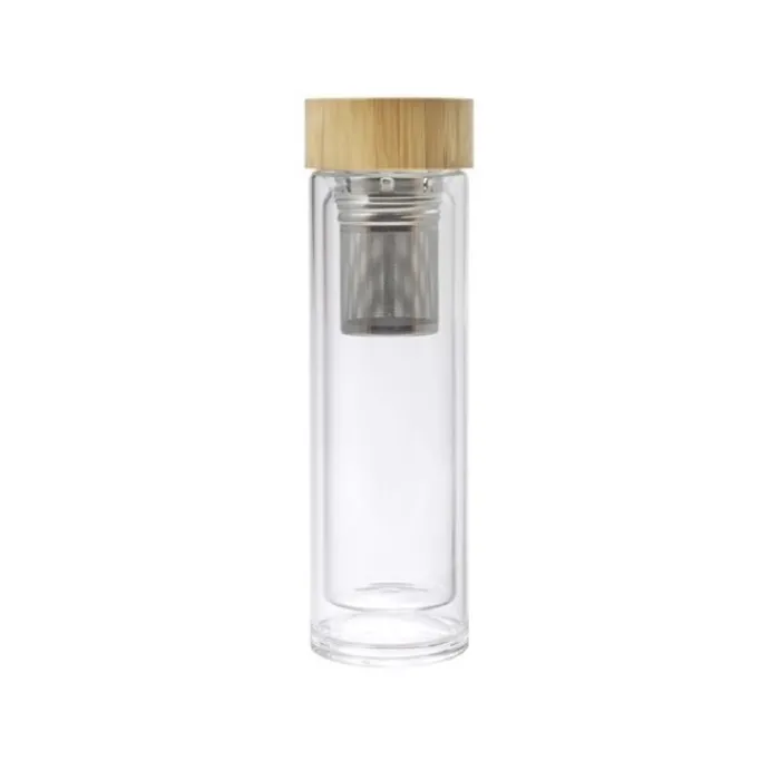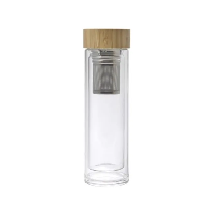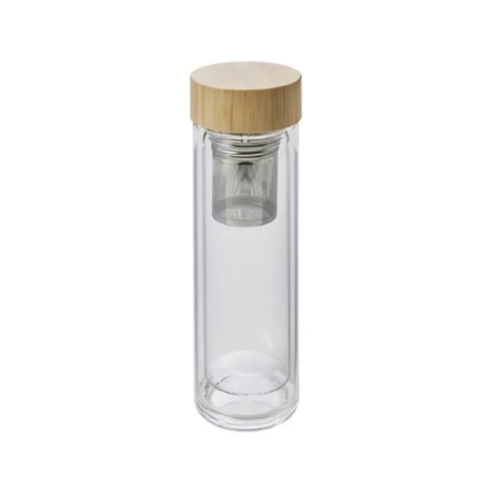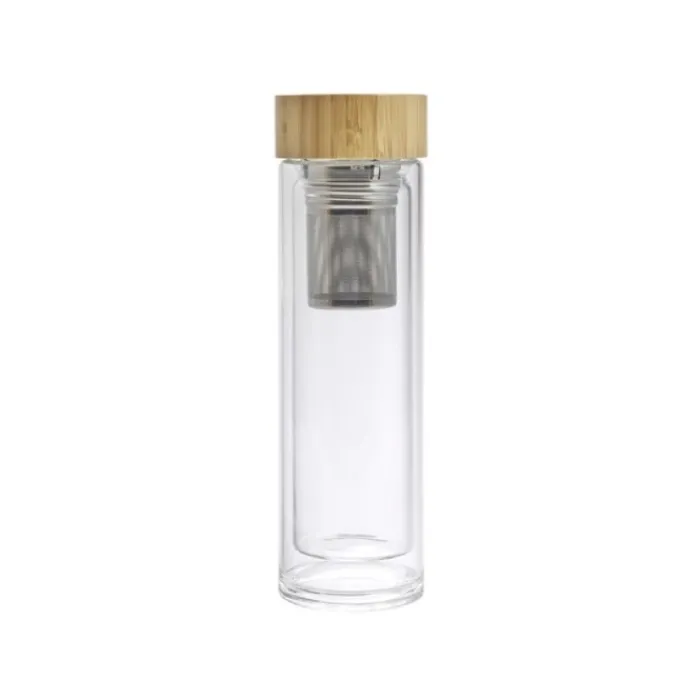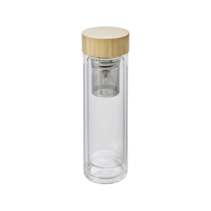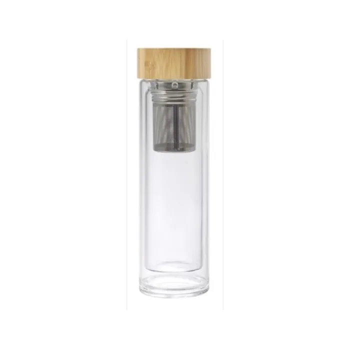 Thermos in vetro, doppia parete, coperchio in bamboo include infusore per tè in metallo, capacità 420 ml