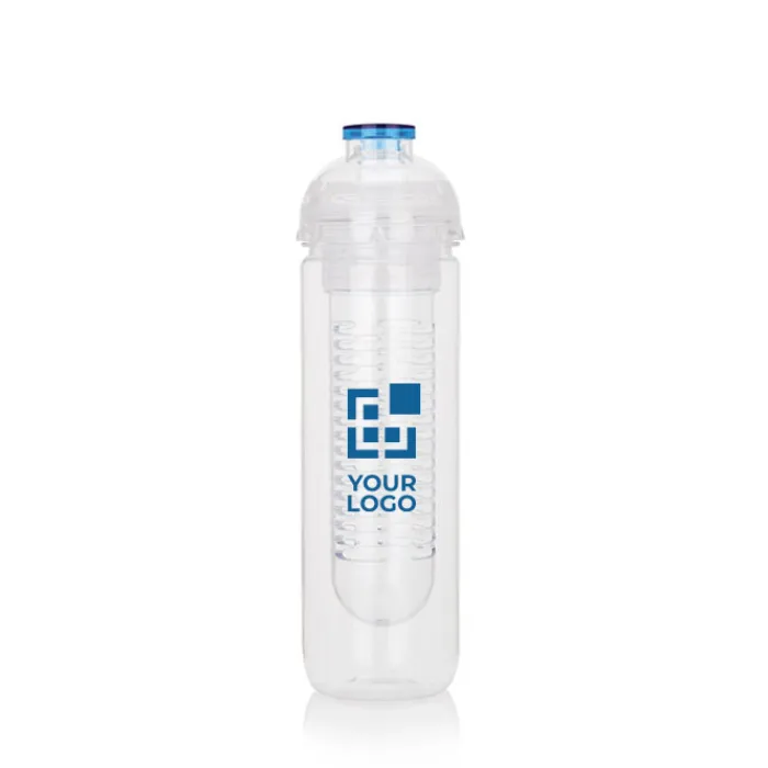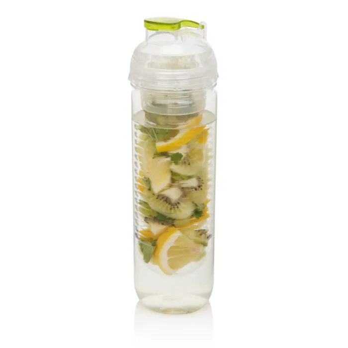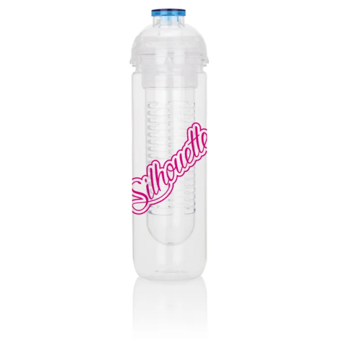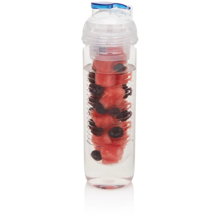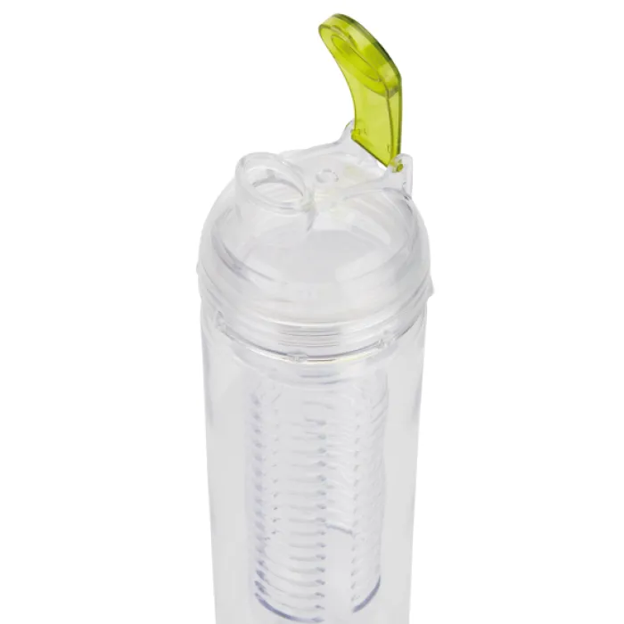 Borraccia in tritan trasparente da 500 ml con scomparto a infusore, ideale per inserire frutta o ghiaccio. Tappo con dettaglio colorato.