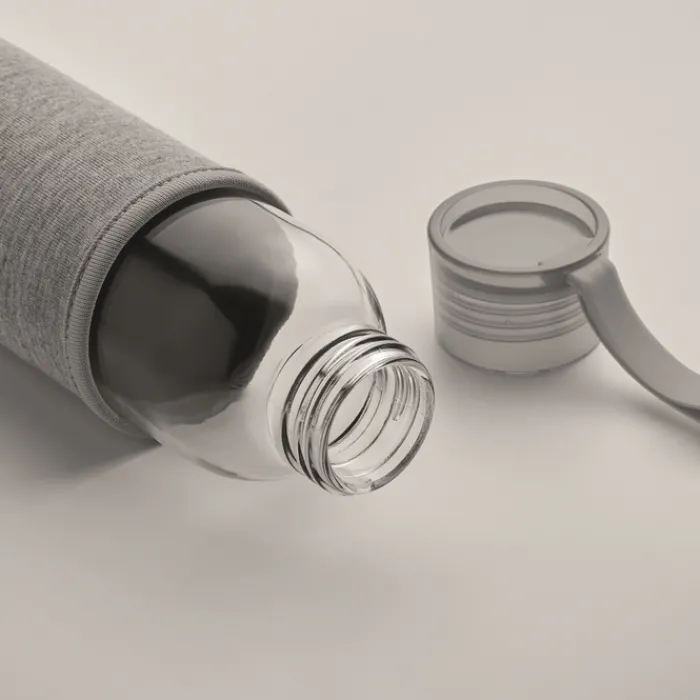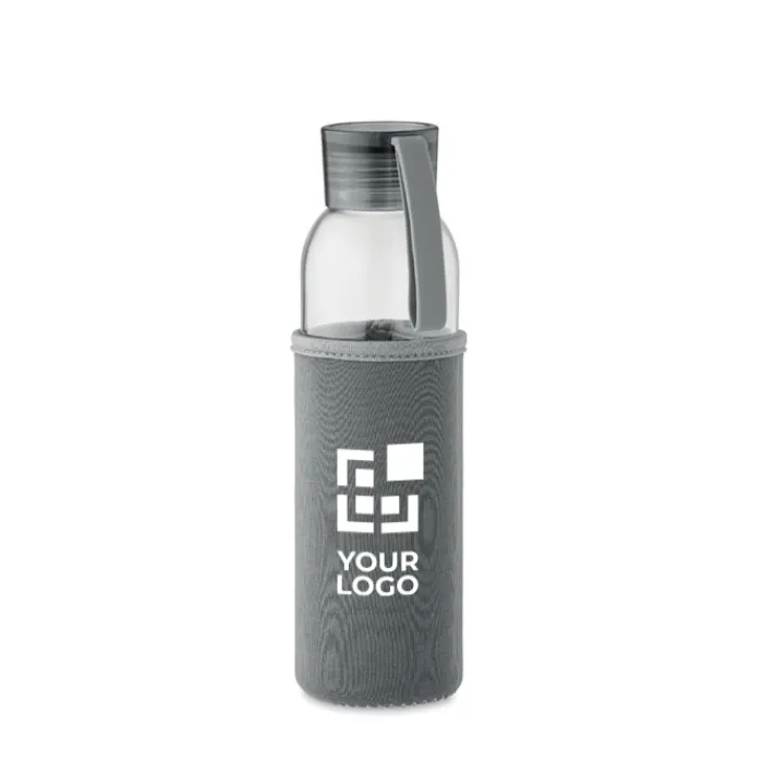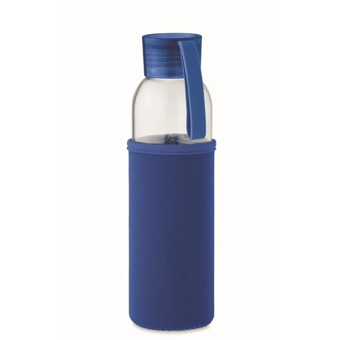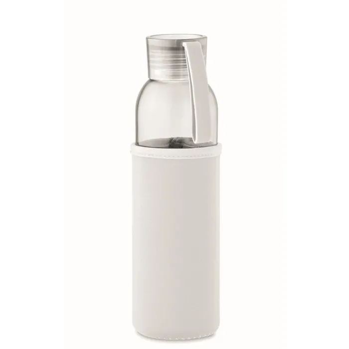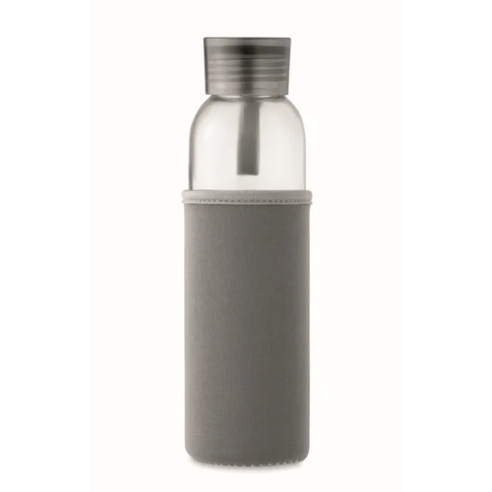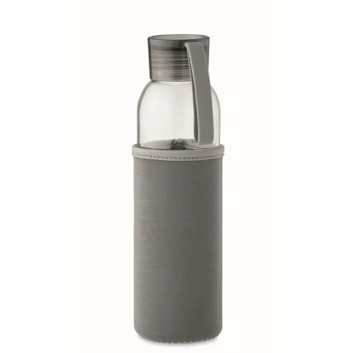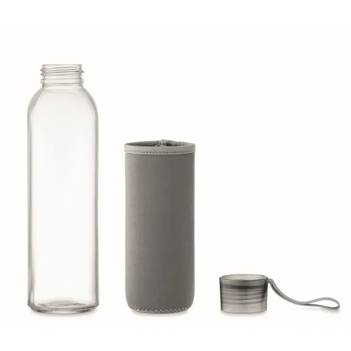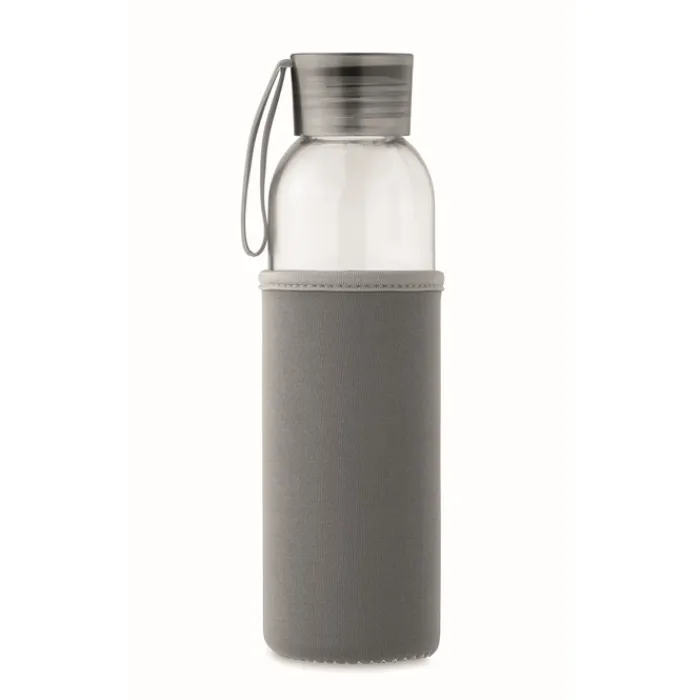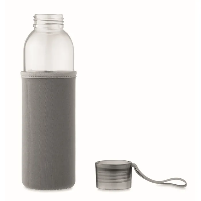 Borraccia in vetro riciclato con custodia in neoprene e tappo anti goccia abbinato in PP con laccetto in silicone. Capacità: 500 ml.