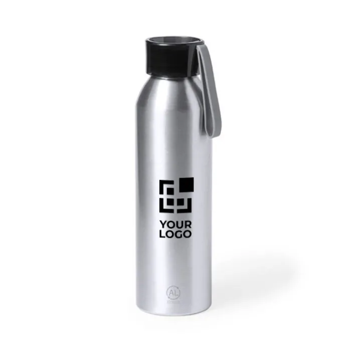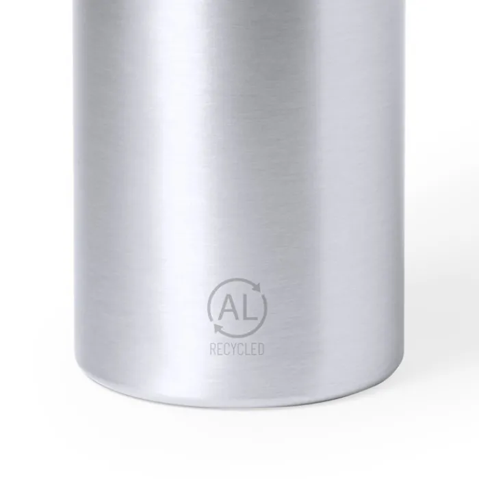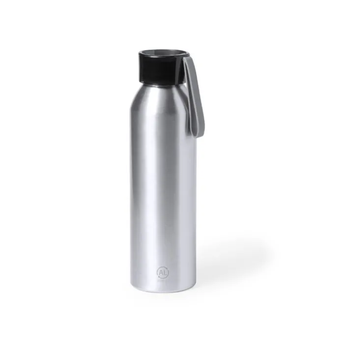 Borraccia da 650 ml, realizzata in alluminio riciclato. Finitura opaca, con tappo a vite e tracolla in silicone, senza BPA. Presentata in una scatola kraft individuale di design.