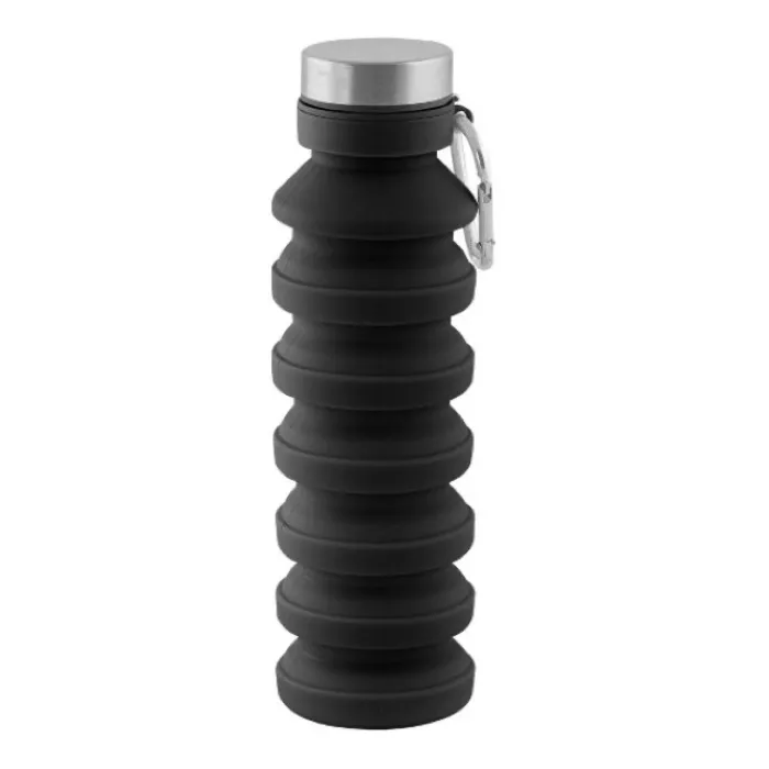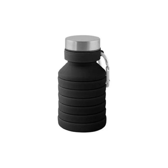 Borraccia pieghevole da 500 ml in silicone. Tappo e pratico moschettone in metallo. Ha il Certificato Lfgb.