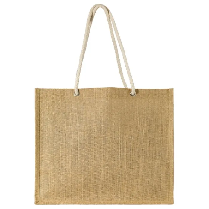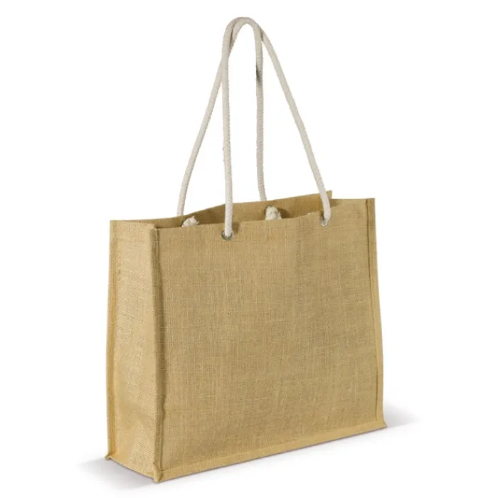 Shopping bag in iuta con manici in corda di cotone da 60cm e spessi 7mm. Supporta un massimo di 8kg.