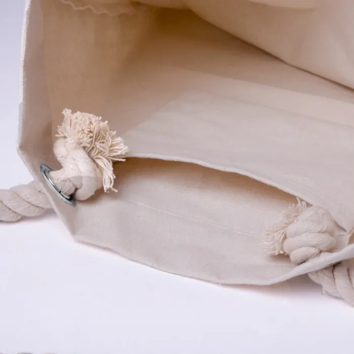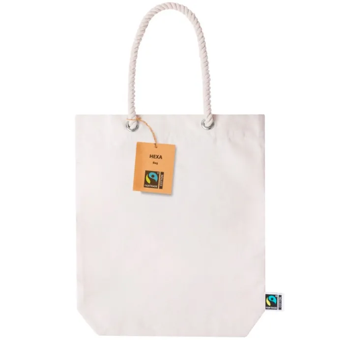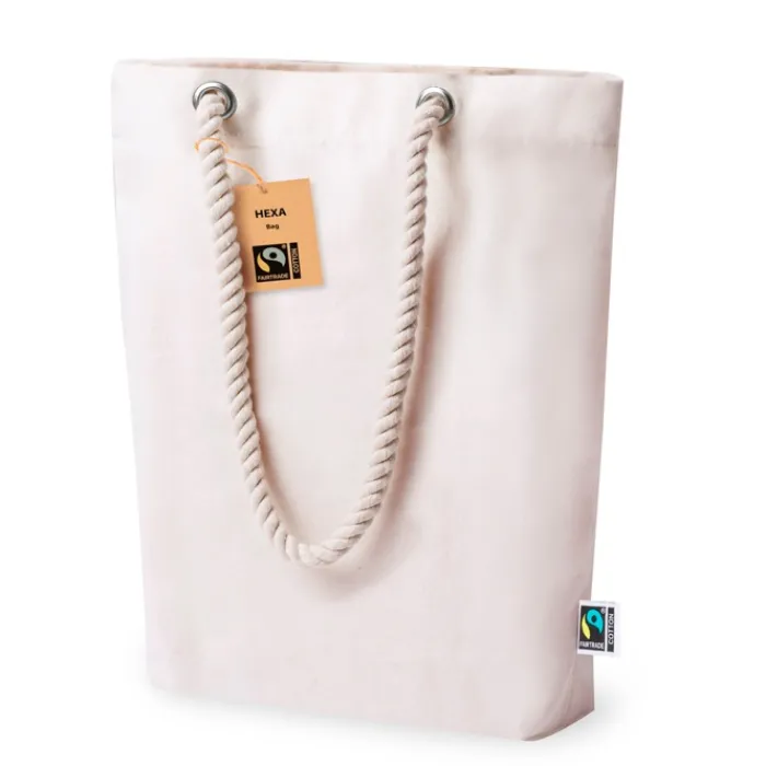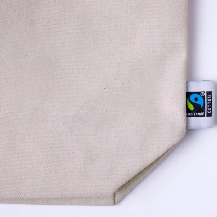 Borsa realizzata in cotone 100% da 280g/m² in colore naturale. Con finitura cucita, manici in corda con anelli per una maggiore rinforzo. Supporta fino a 10kg di peso. Presenta l’etichetta del Fairtrade e del cotone riciclato. Il Fairtrade é un sistema commerciale solidale e alternativo a quello convenzionale che persegue lo sviluppo delle persone e la lotta alla povertà.