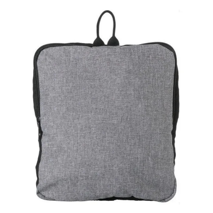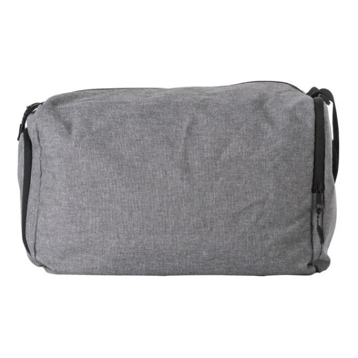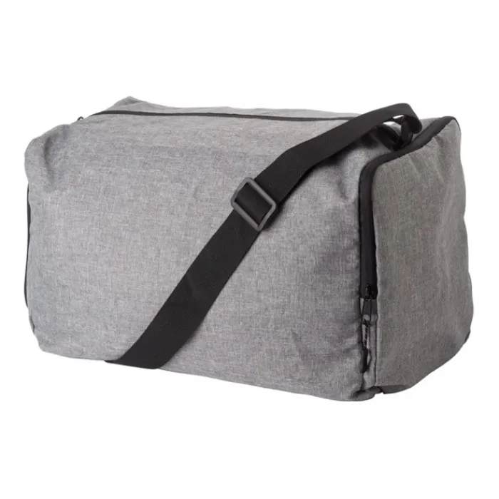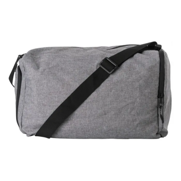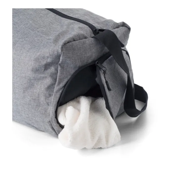 Borsone in poliestere 300 D grigio con dettagli in neri. Ha una tasca laterale per ripiegare la parte posteriore e una tasca laterale destinata alle scarpe. Tracolla regolabile. Viene consegnato piegato.