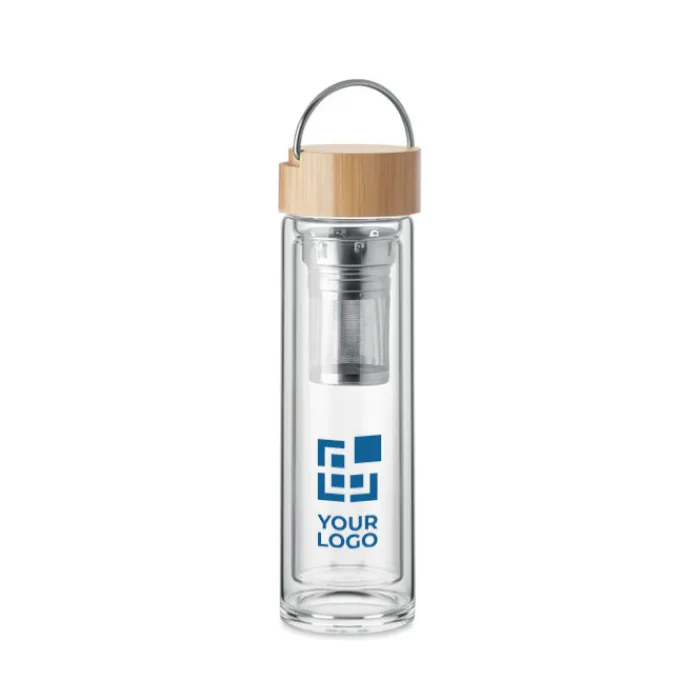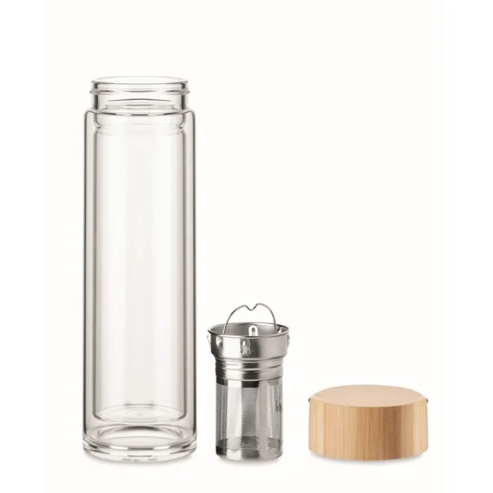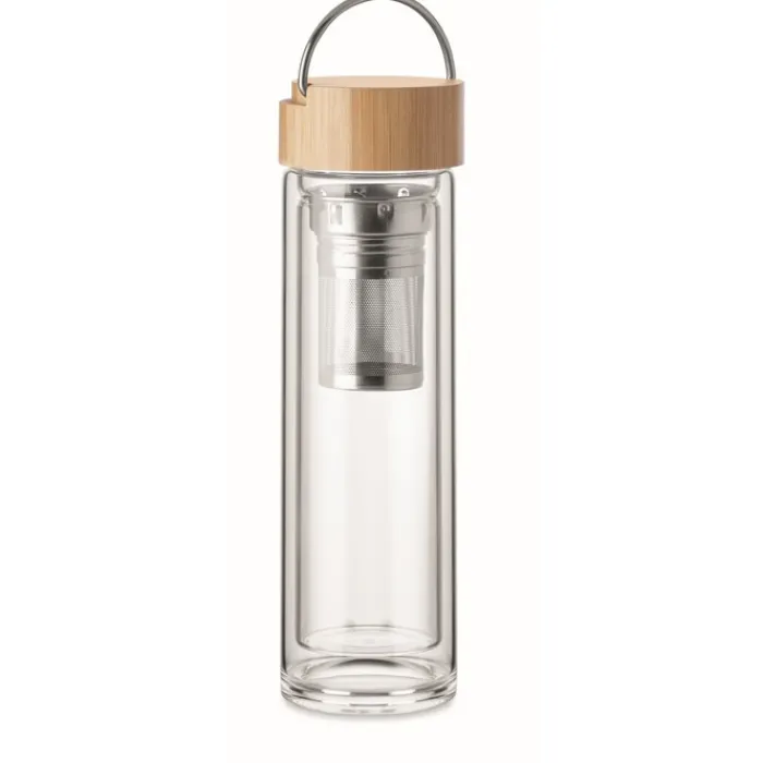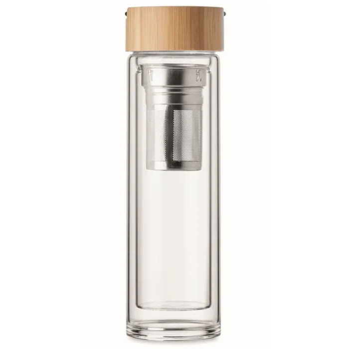 Bottiglia di vetro a doppia parete con infusore per il tè e tappo in bambù con manico. Capacità: 400ml.