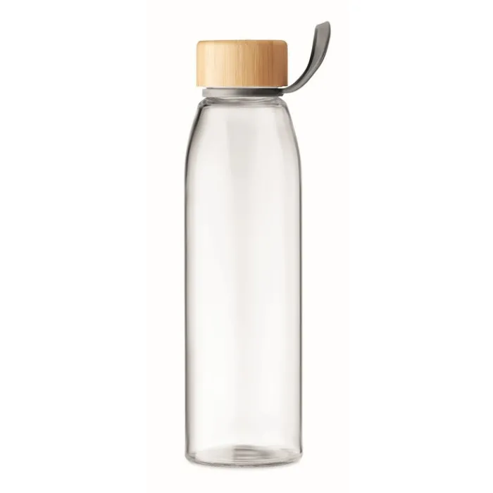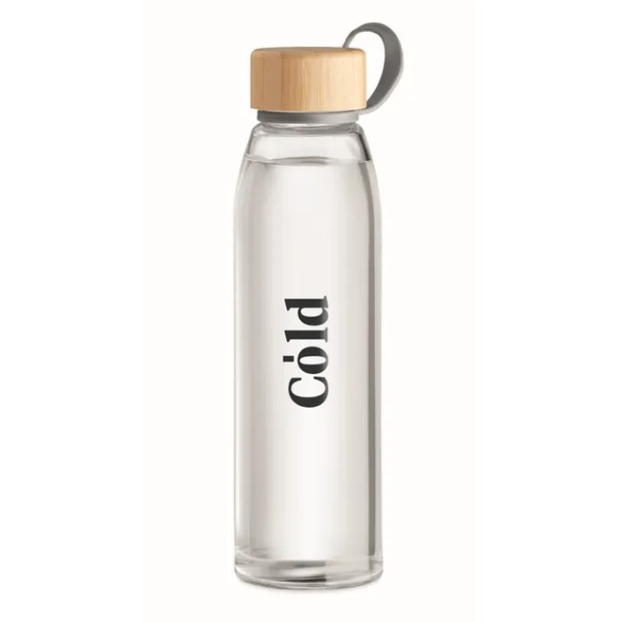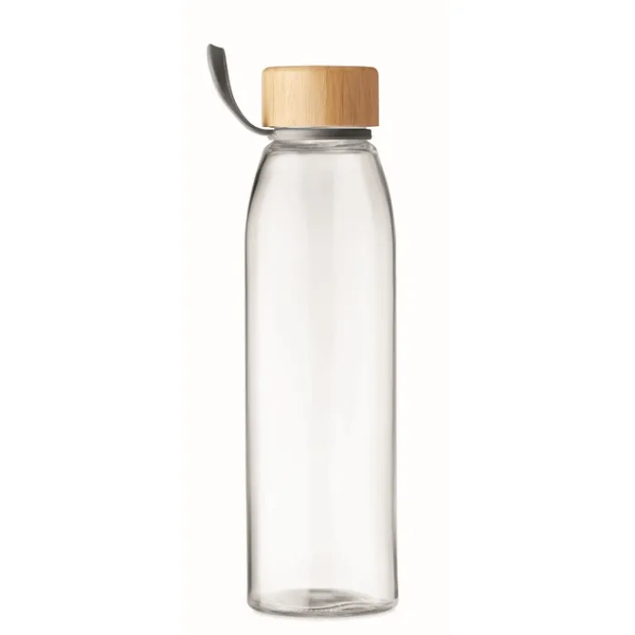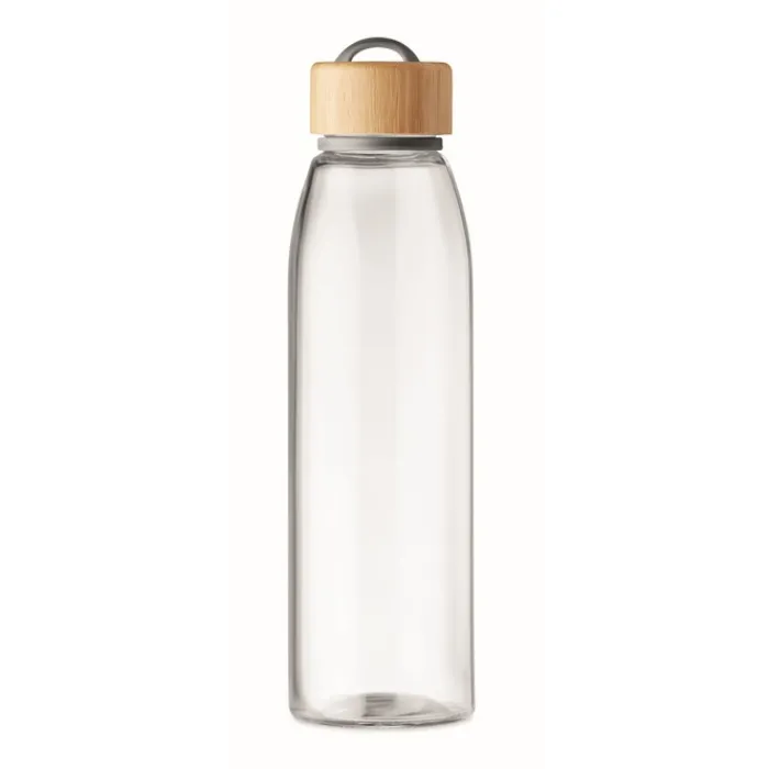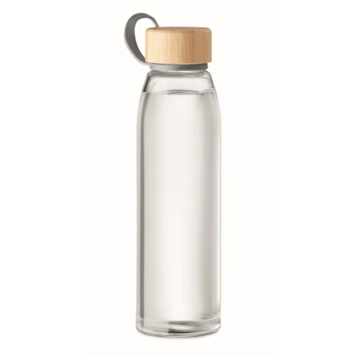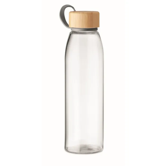 Bottiglietta in vetro con tappo in bambù anti goccia e laccetto in TPU. Non adatto a bevande gassate. Capacità 500ml.