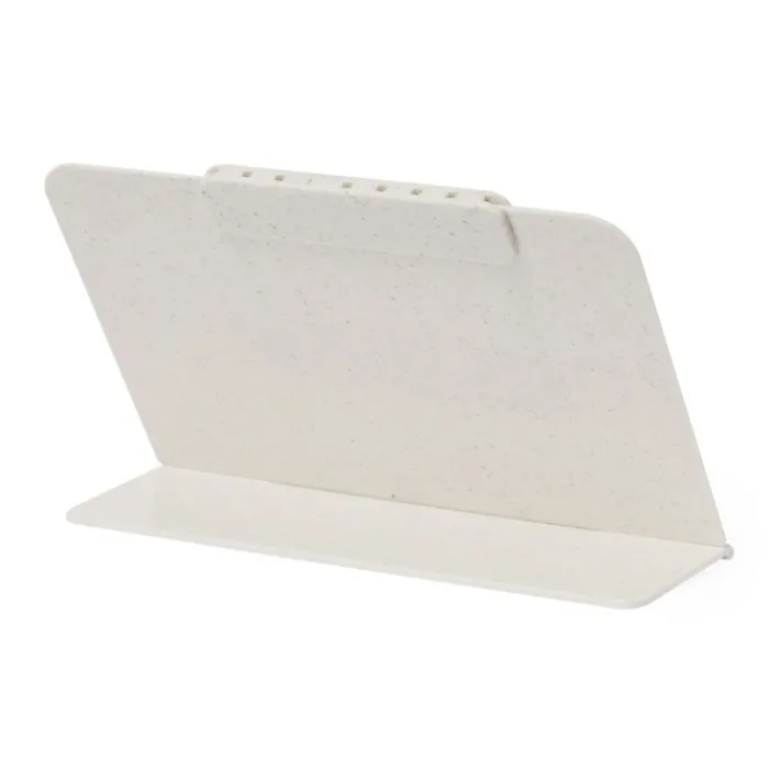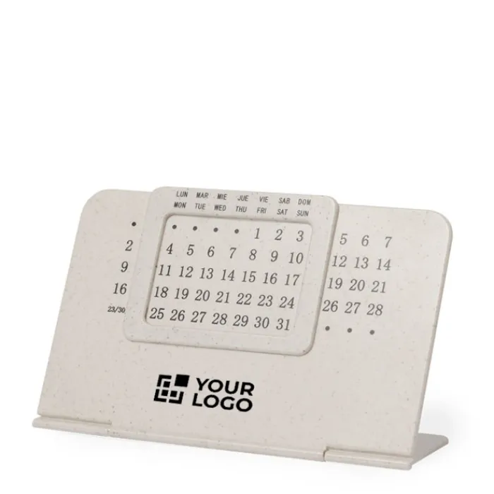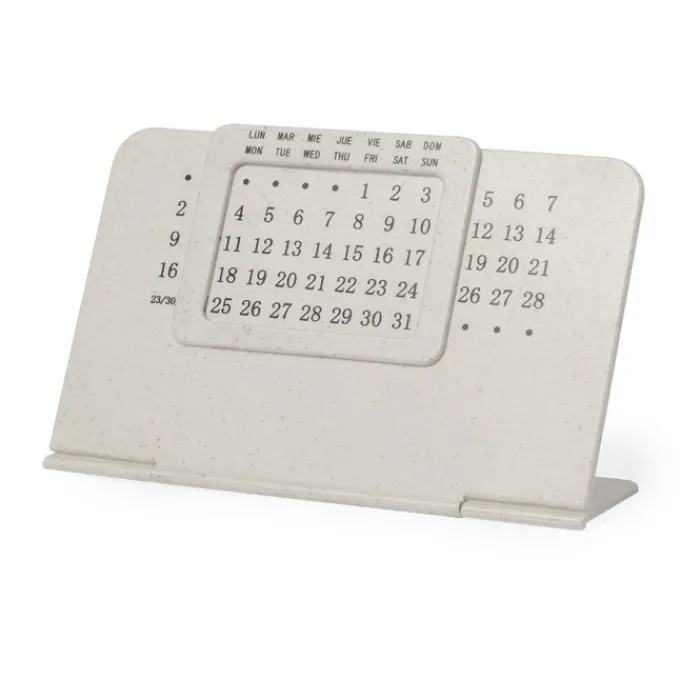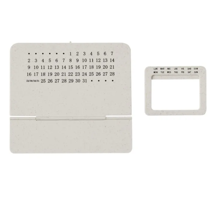 Calendario perpetuo realizzato in paglia di grano e ABS con supporto pieghevole. La paglia di grano promuove l’uso di materie prime naturali, riducendo così le emissioni inquinanti.