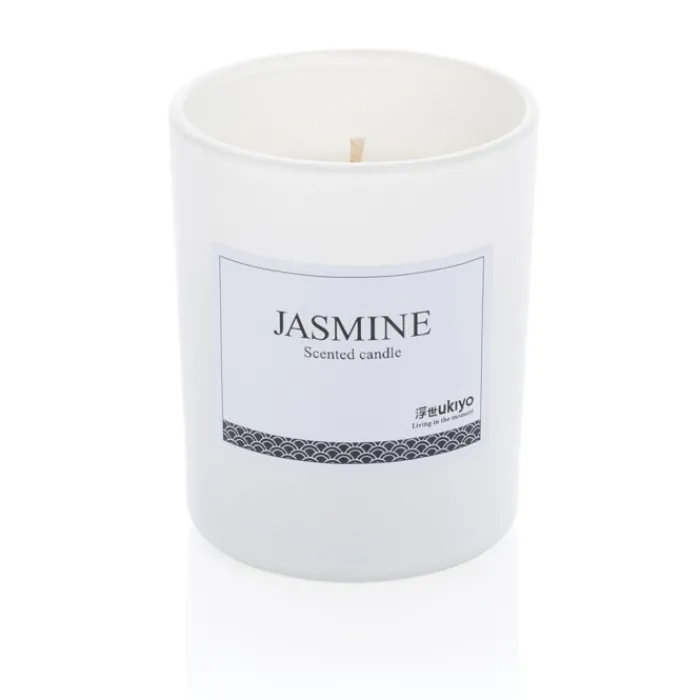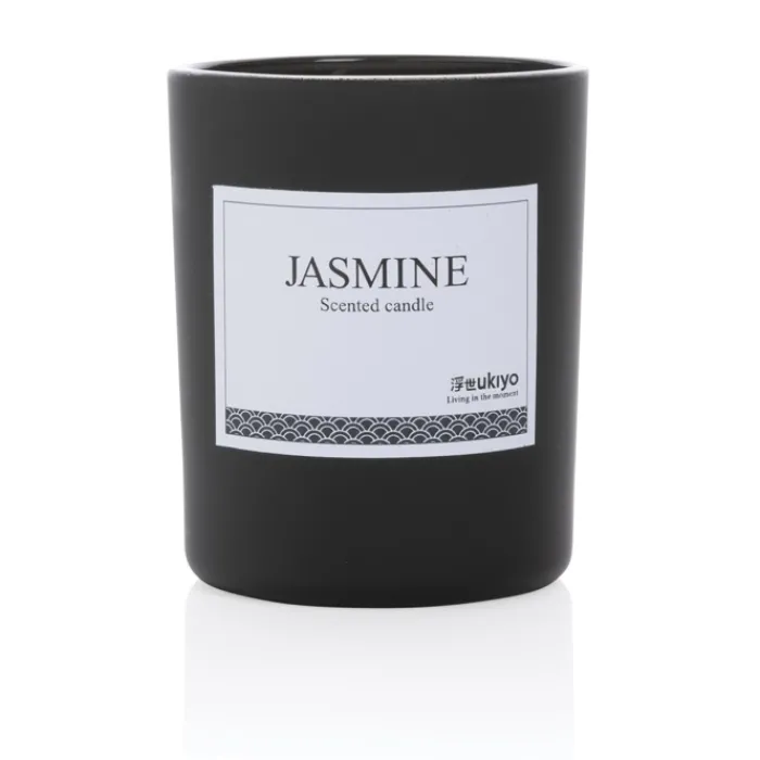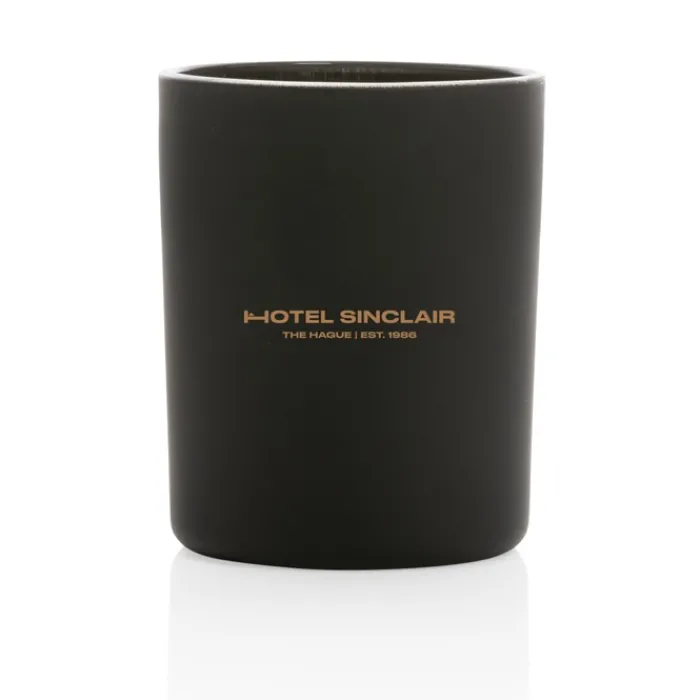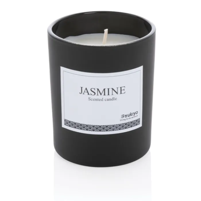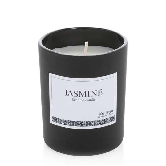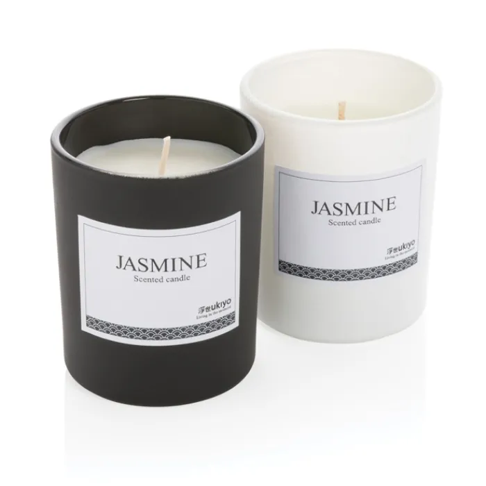 Candela profumata in un elegante contenitore di vetro colorato in bianco o nero.