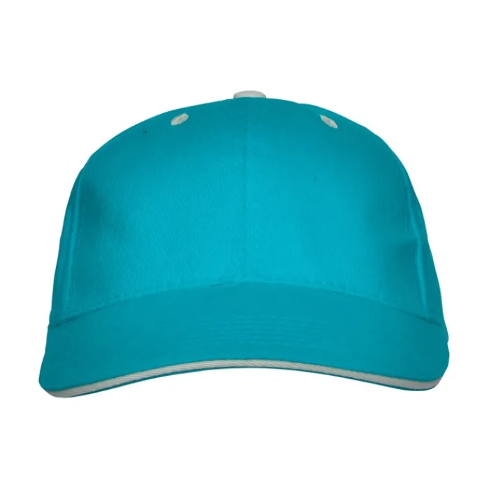 Cappellino a 6 sezioni in 100% cotone, con trama a contrasto. Dotato di 6 fori di ventilazione e chiusura regolabile a velcro. Etichetta rimovibile.