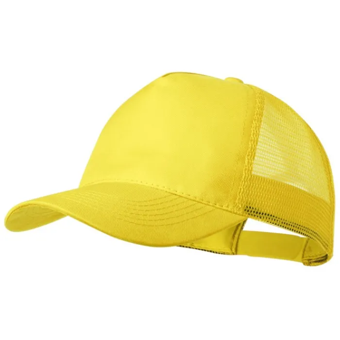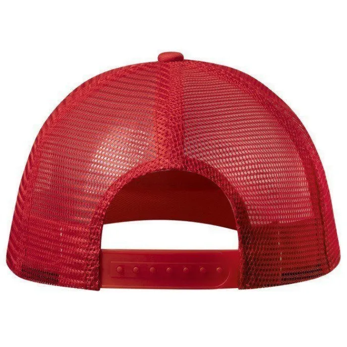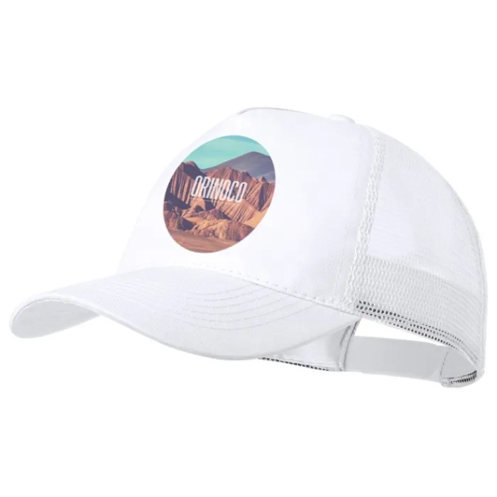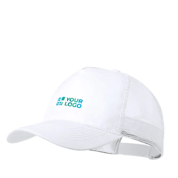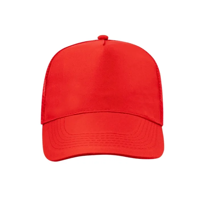 Cappellino a 5 pannelli in poliestere, con tessuto a rete e chiusura in plastica regolabile. Disponibile in una vasta gamma di colori (colore bianco appositamente realizzato per la stampa a sublimazione).