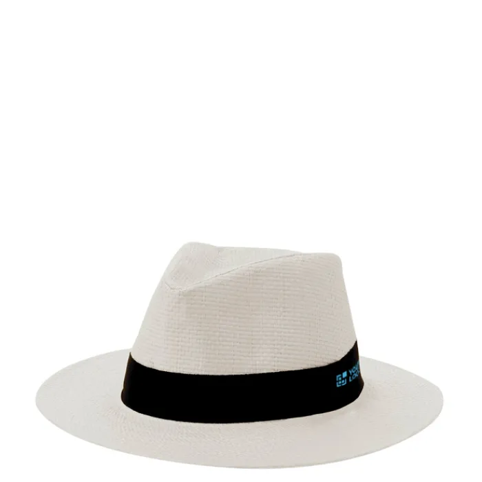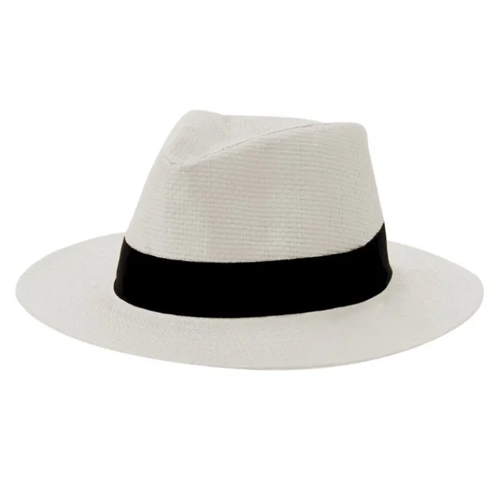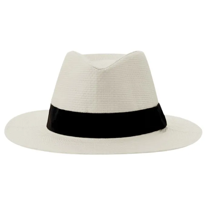 Cappello di alta qualità realizzato in paglia di carta bianca, con nastro alla base di colore nero. Regolabile dall’interno, con nastro esterno e comodo nastro interno.