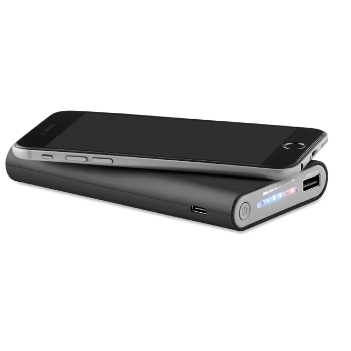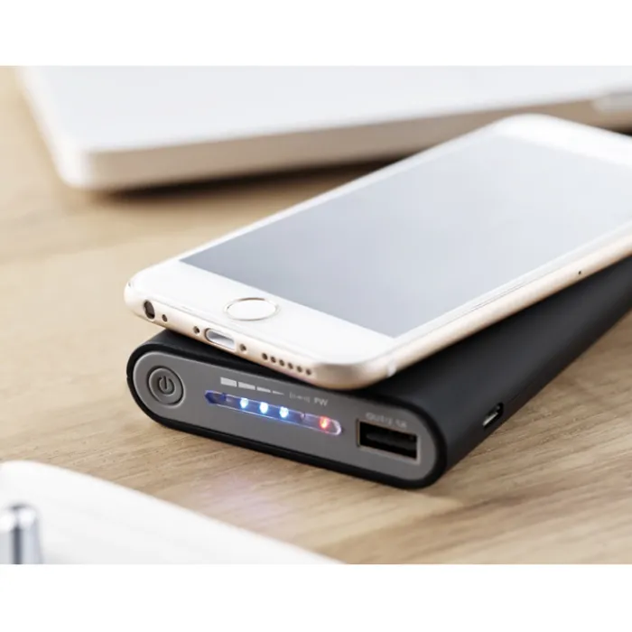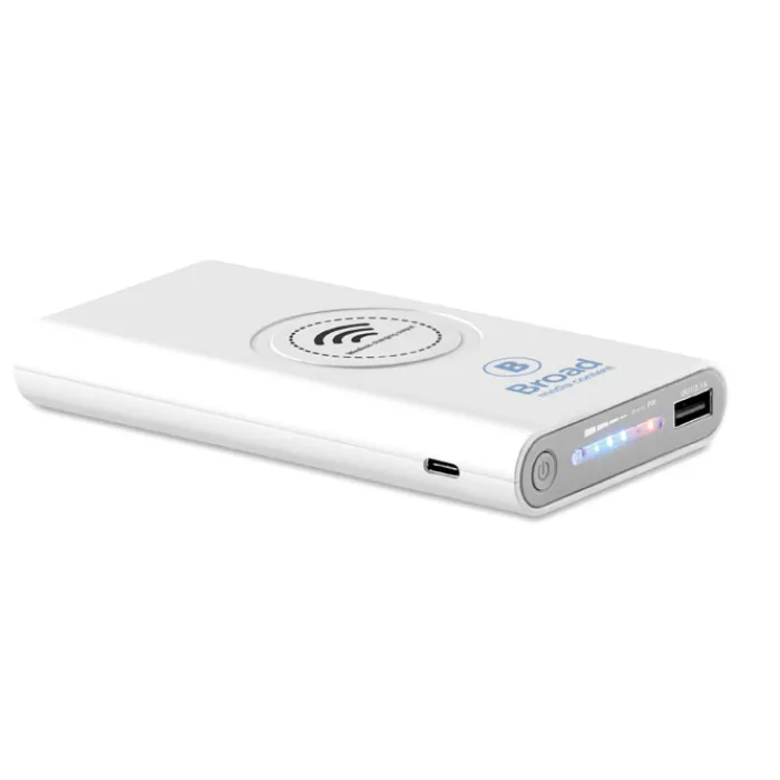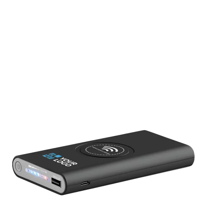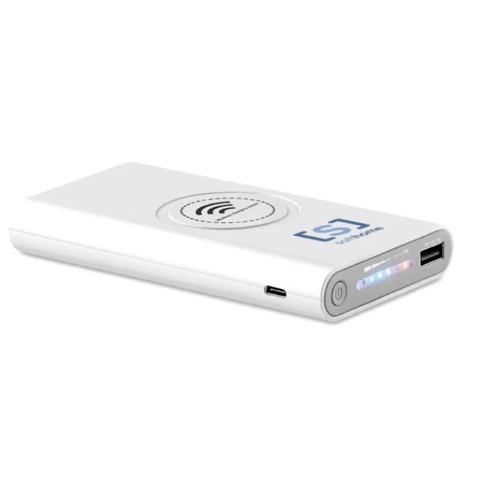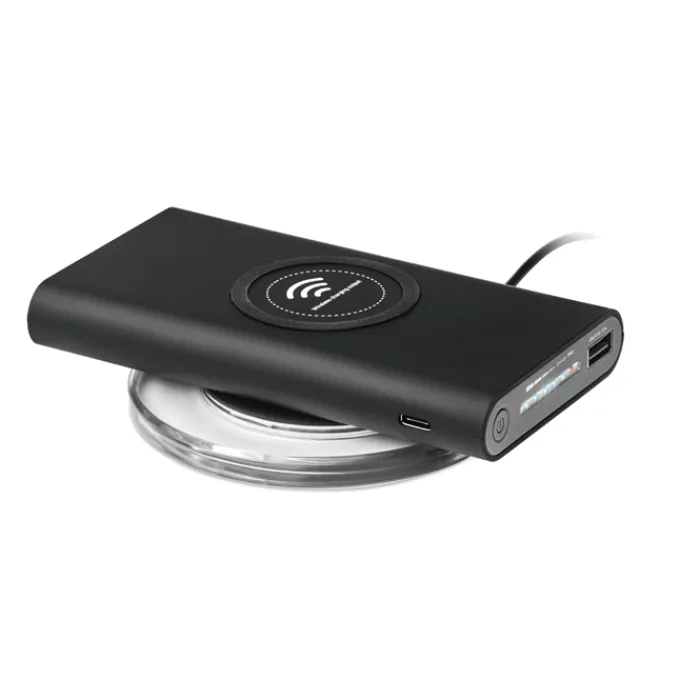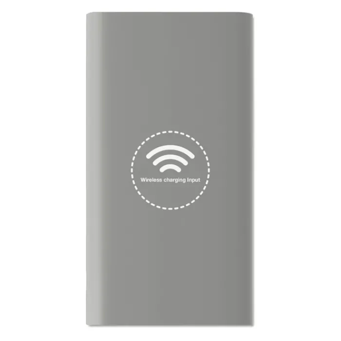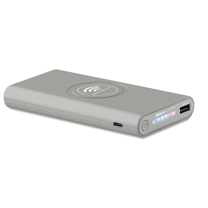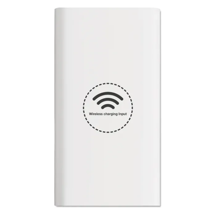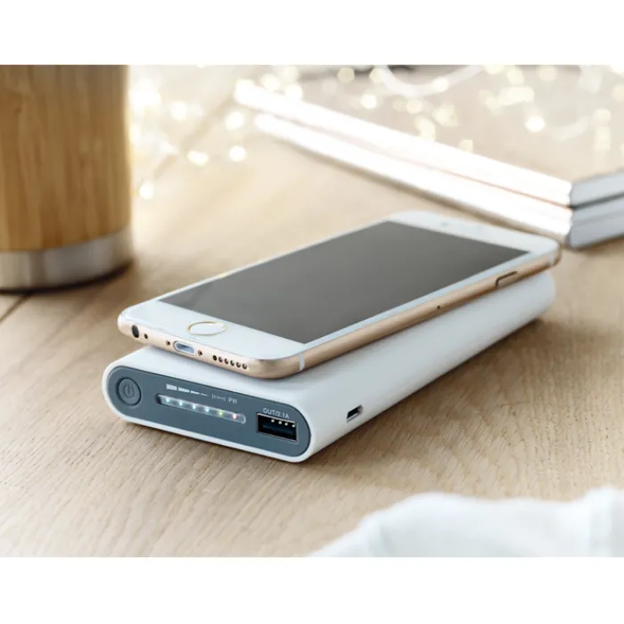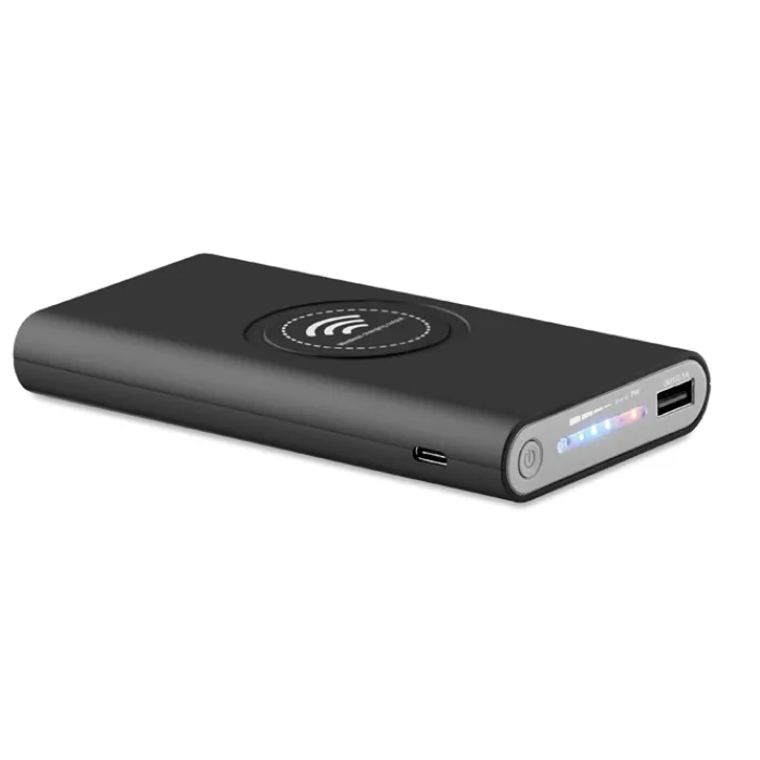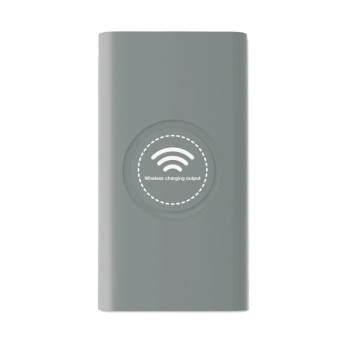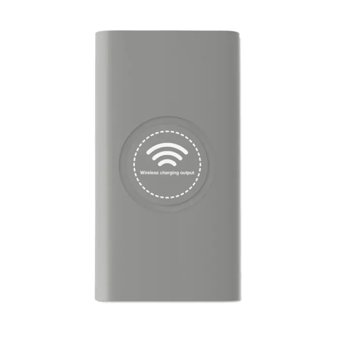 Power bank wireless da 8000mAh in ABS con finitura gommata. Posare lo smartphone sopra per ricaricarlo. Connettore di tipo C incluso.