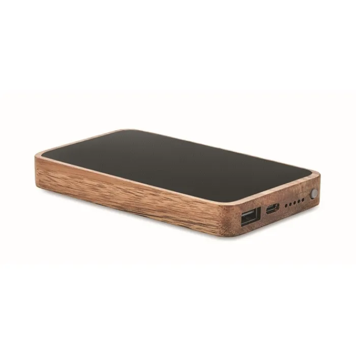 Caricabatterie wireless rettangolare da 15 W con power bank da 4.000 mAh in legno di acacia e PU riciclato al 58% (40% poliestere riciclato e 18% PU riciclato). Supporta la tecnologia di ricarica rapida (20 W). Ingresso/Uscita: Tipo C.