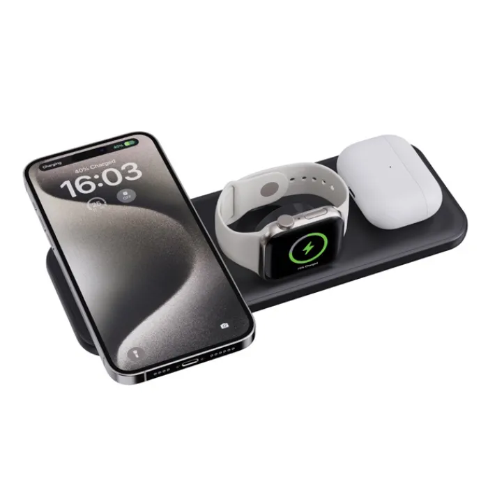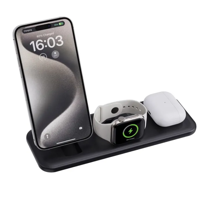 Hai bisogno di caricare tutti i tuoi dispositivi contemporaneamente e alla massima velocità? Torrance ha pensato a te con il suo caricatore magnetico ultraveloce da 15W. Può essere utilizzato sia come piedistallo che in posizione orizzontale. Utilizzalo come supporto per caricare i telefoni a ricarica magnetica o per qualsiasi altro telefono wireless. Utilizza il pad di ricarica centrale da 5W per caricare un secondo telefono o gli auricolari. Per finire, utilizza il caricatore per orologi per caricare le ultime generazioni di iWatch. Torrance è dotato di un cavo in TPE riciclato di 120 cm per una facile installazione sulla scrivania o sul comodino. È sufficiente collegarlo a una fonte di alimentazione a ricarica rapida (minimo 9V/2A) per iniziare. Torrance è realizzato con ABS riciclato certificato RCS (Recycled Claim Standard). Contenuto totale di materiale riciclato: 37% in base al peso totale dell’articolo. Gli articoli Urban Vitamin sono realizzati senza PVC e confezion