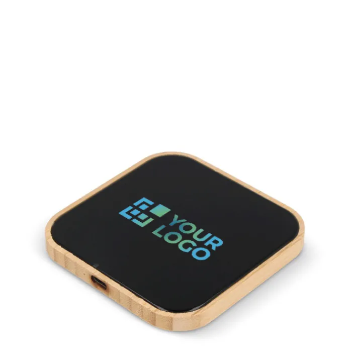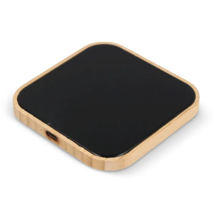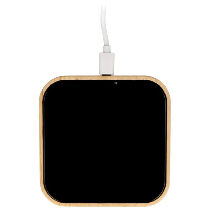 Caricatore wireless da 10W realizzato in vetro elegante e bambù sostenibile. Ingresso: DC 5V/2A. Tensione di uscita DC 5V/1A. Consegnato con cavetto di ricarica da 90 cm.