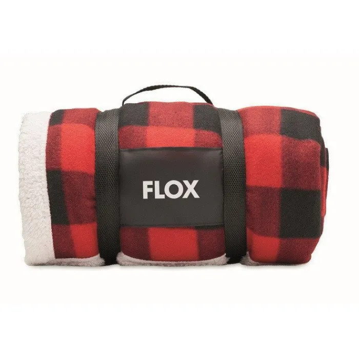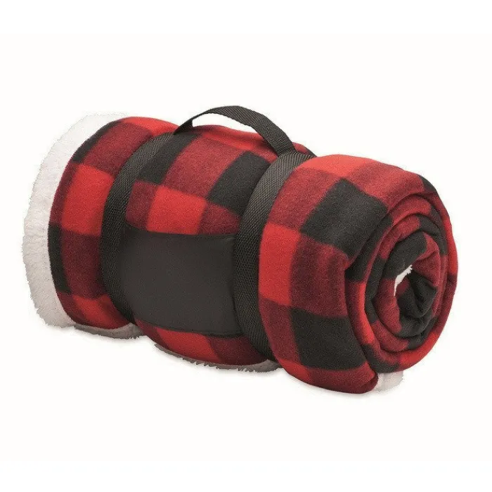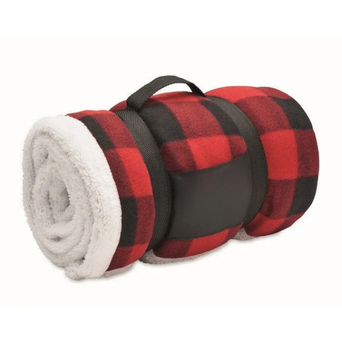 Coperta a quadri in pile foderata in sherpa di rPET da 180 gr/m² e sherpa di poliestere da 230 gr/m². Presentata con manico per il trasporto in nylon RPET.