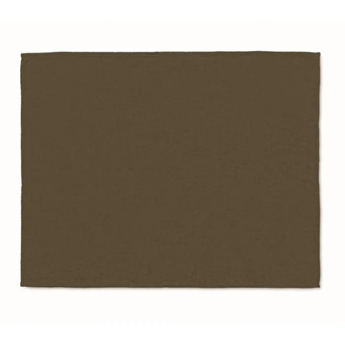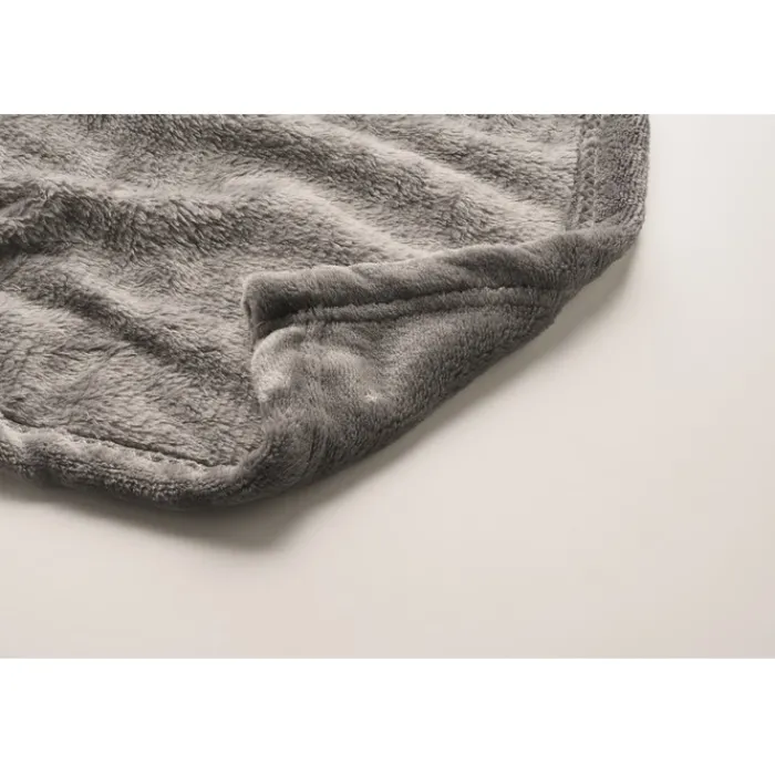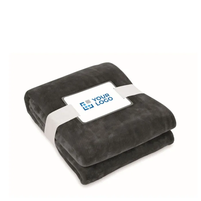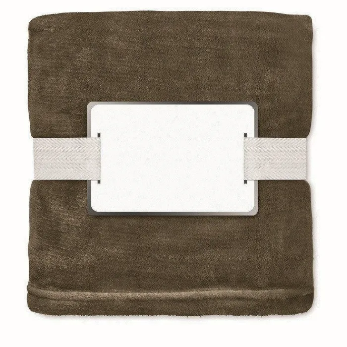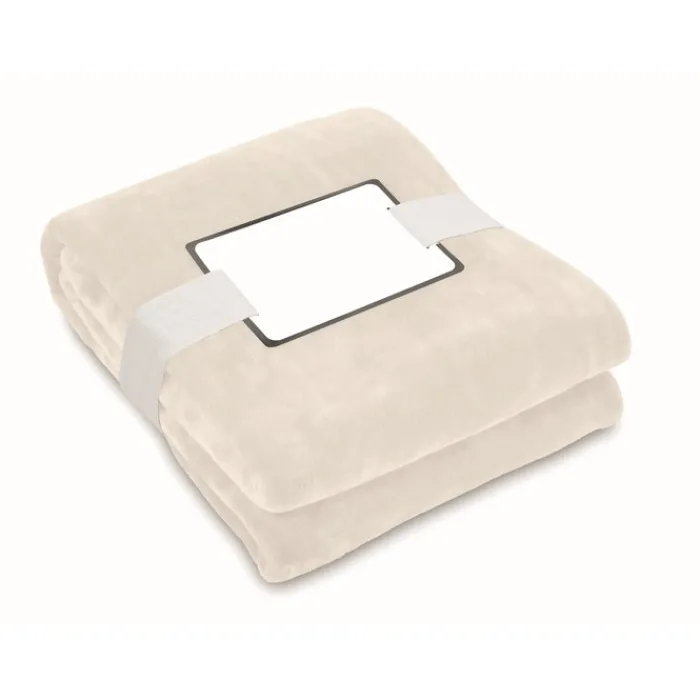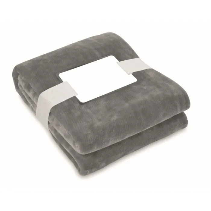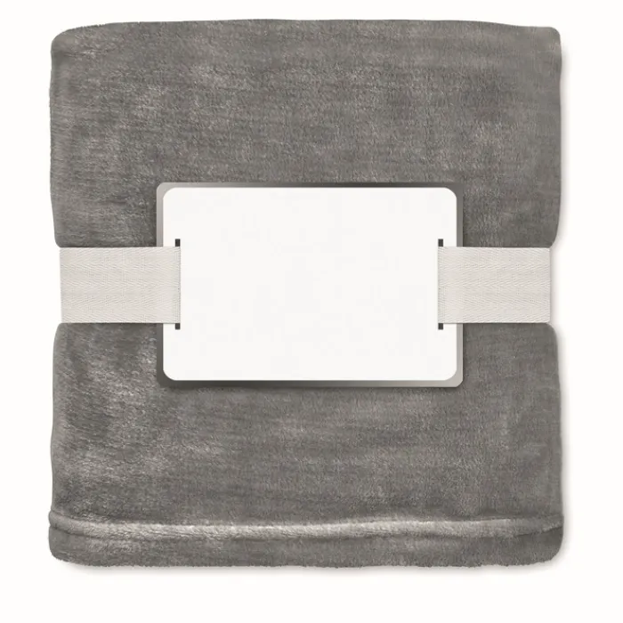 Coperta in pile di flanella RPET da 280 gr/m² avvolta da un nastro e cartoncino stampabile.