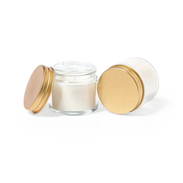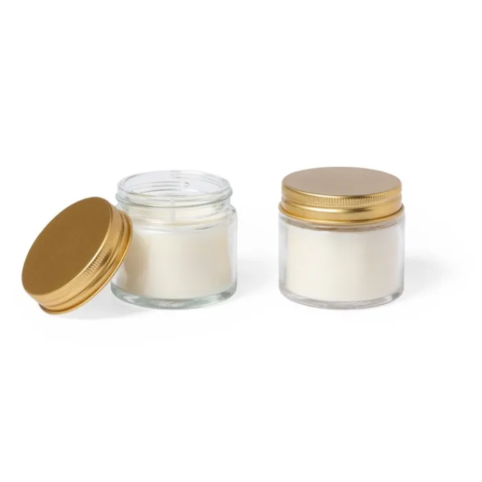 Set di candele profumate, con cera vegetale e profumo ai fiori di Fresia. Contenute in un vasetto di vetro con tappo a vite metallico e finitura dorata. Presentato in una scatola singola in kraft.