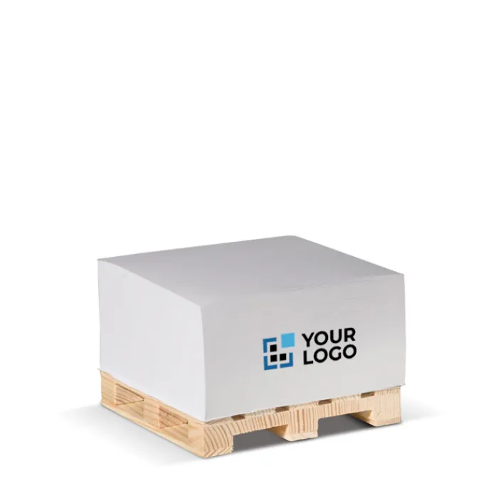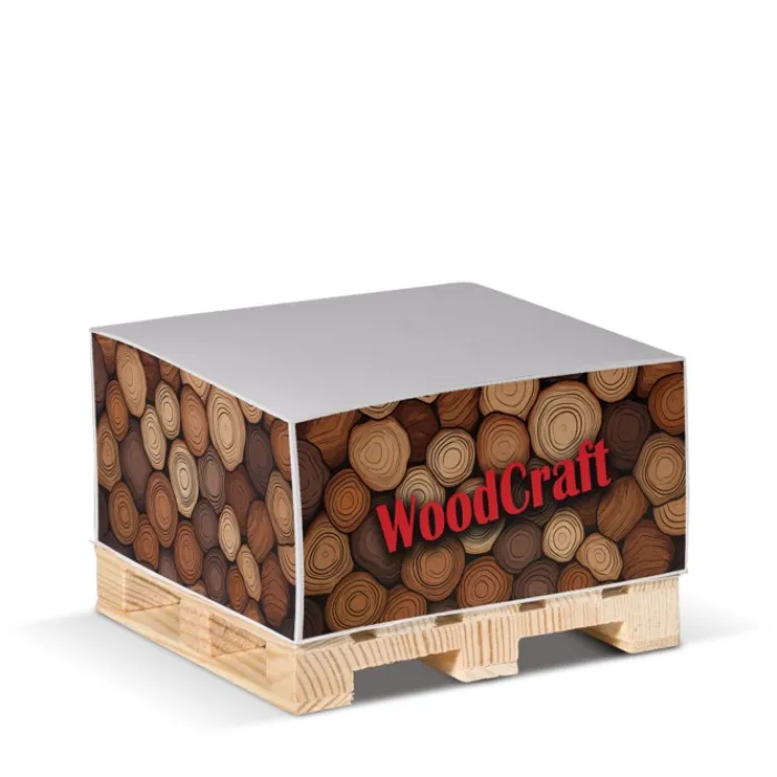 Cubo post-it con carta liscia FSC su pallet di legno. Ideale per la casa o l’ufficio. Circa 420 fogli. Ogni cubo è avvolto in plastica termoretraibile.