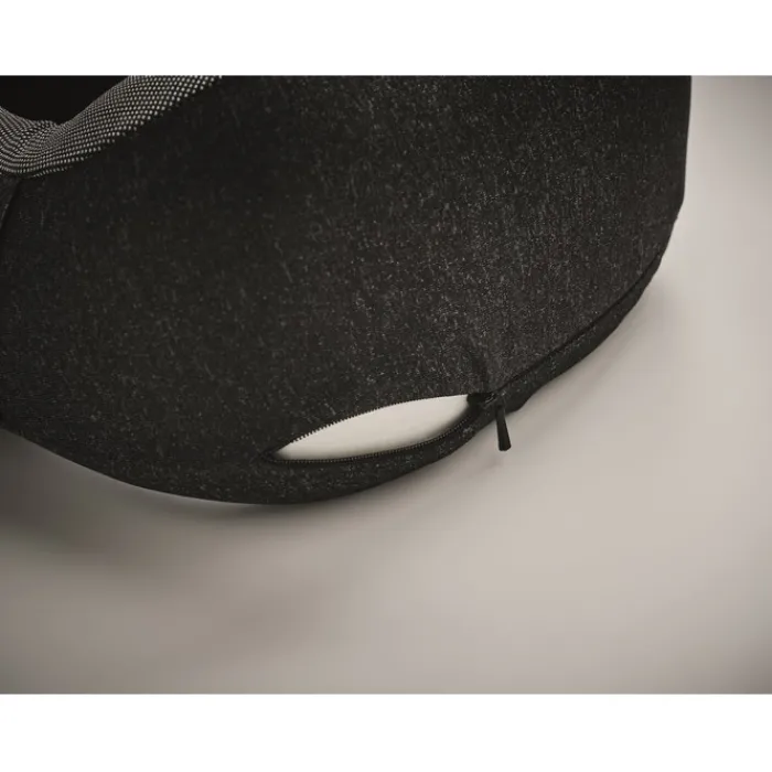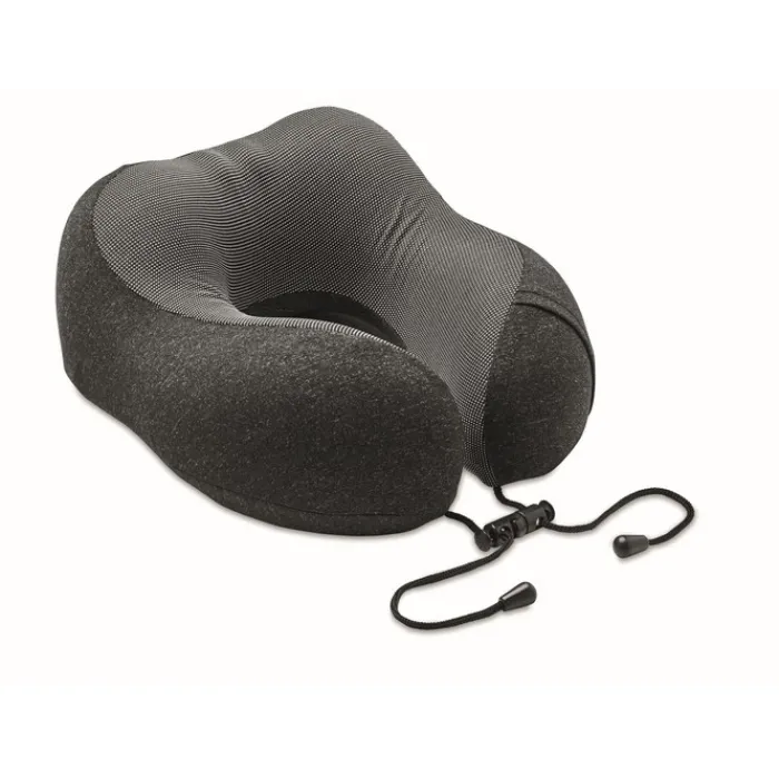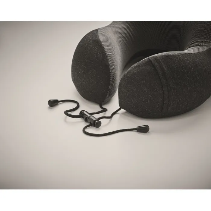 Cuscino da viaggio in tessuto cationico. Contenuto all’interno di un sacchetto con cordoncino in poliestere RPET. Ideale da portare in auto, in treno o in aereo.
