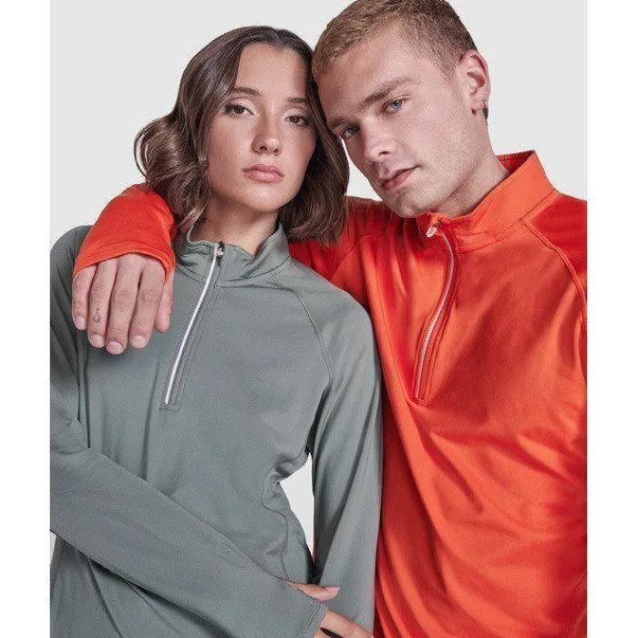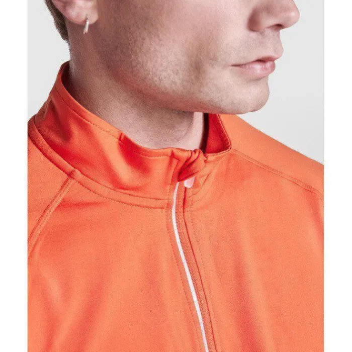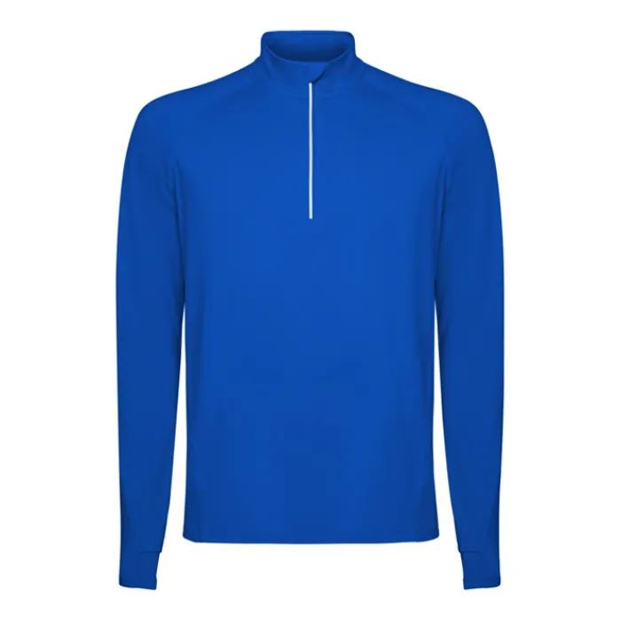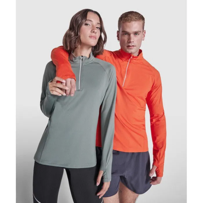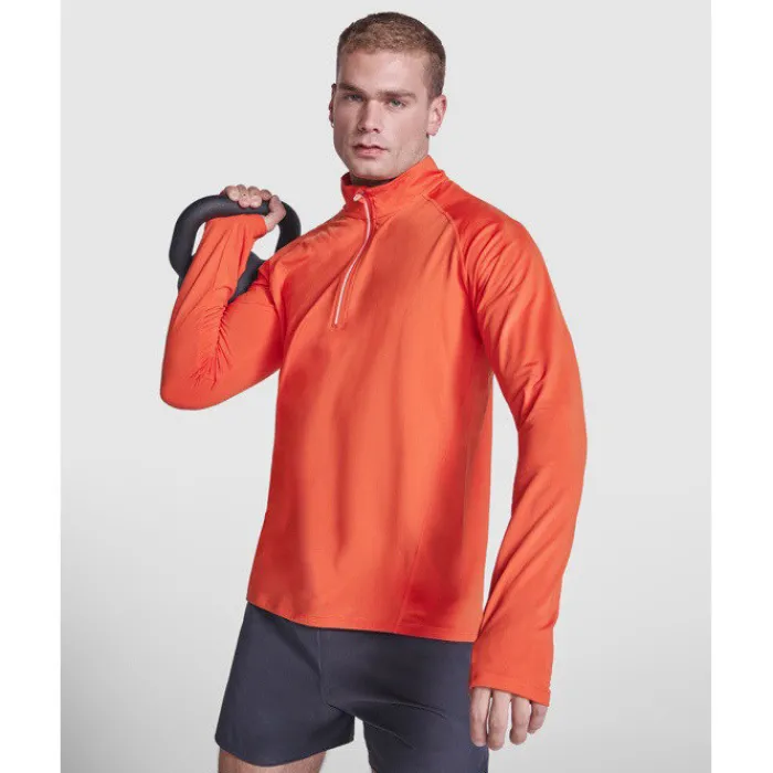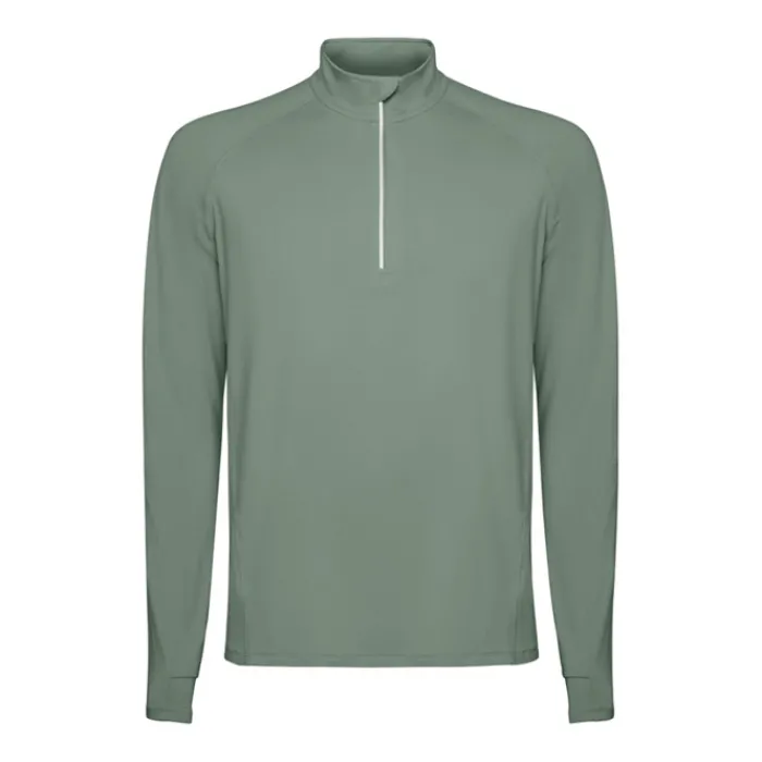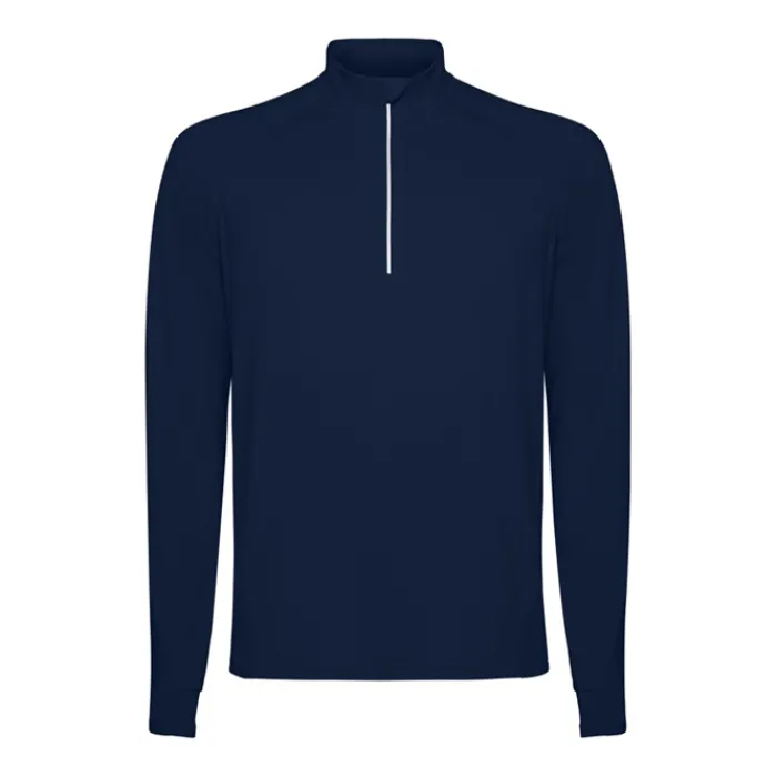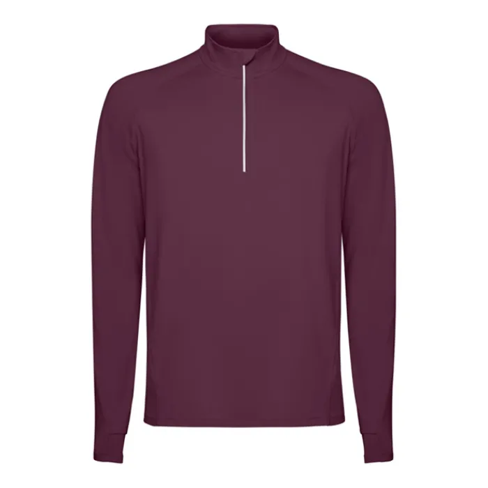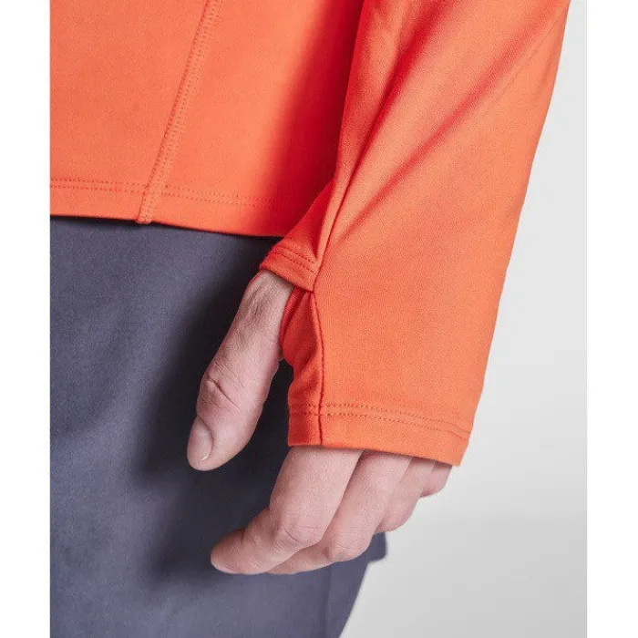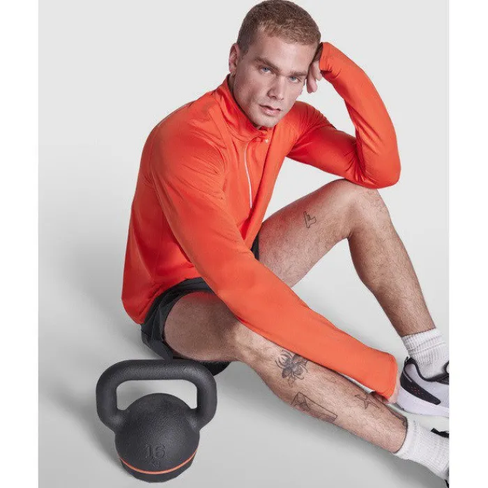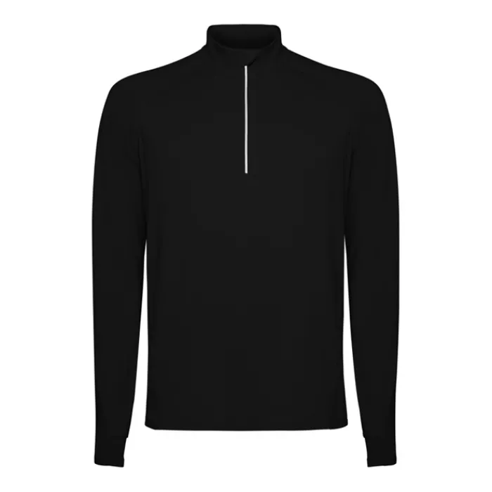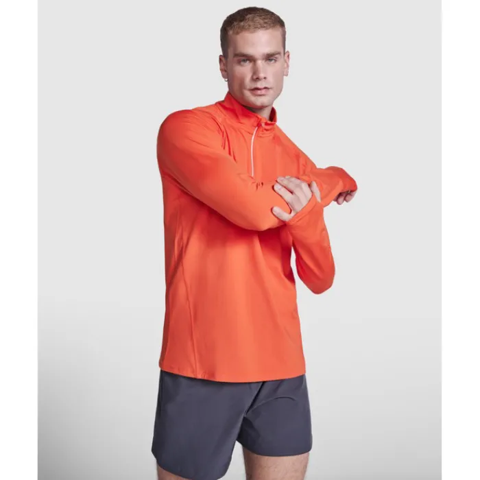 Felpa tecnica a maniche lunghe raglan, colletto a mezza zip con design inverso e dettagli catarinfrangenti. Copricuciture rinforzate e polsini con aperture per il pollice. Dettagli catarinfrangenti sulla parte posteriore. Orlo posteriore leggermente più lungo rispetto a quello anteriore. Tessuto interno spazzolato, caldo e confortevole.
