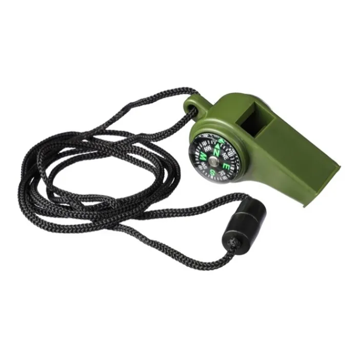 Fischietto in PP (90 dB) con bussola e termometro laterale. Il termometro mostra la temperatura in gradi Celsius. Include cordino in poliestere da 100 cm con fibbia di sicurezza in ABS. Confezionato in scatola di cartone marrone.