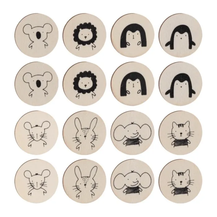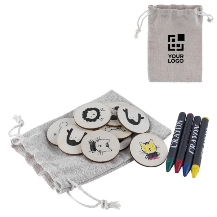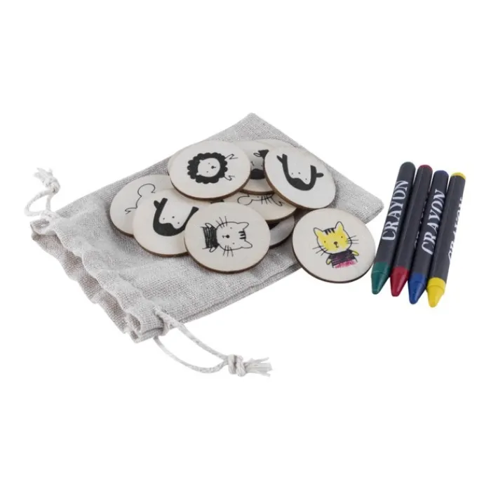 Gioco Memory per bambini con tessere in legno con animali da colorare contenute in un sacchetto di cotone. Vengono inclusi anche quattro pastelli a cera (rosso, giallo, blu e verde) per colorare.