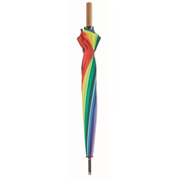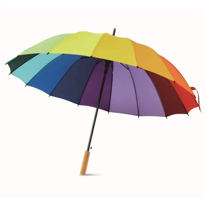 Ombrello da 27 pollici, 16 pannelli realizzato in Pongee 190T. Apertura automatica con asta in legno, stecche in fibra di vetro, punte e top in metallo placcato nero.