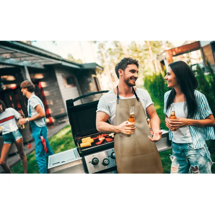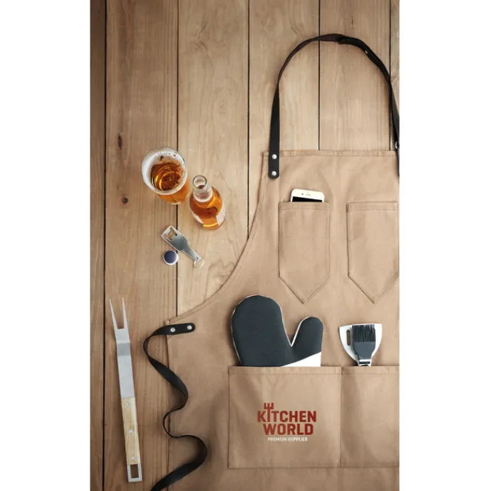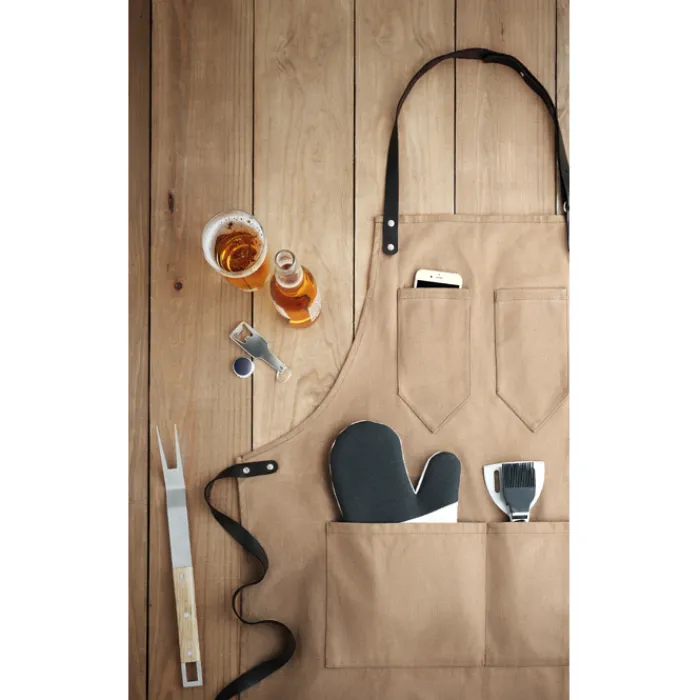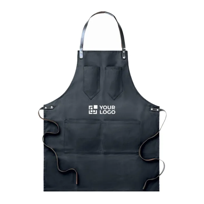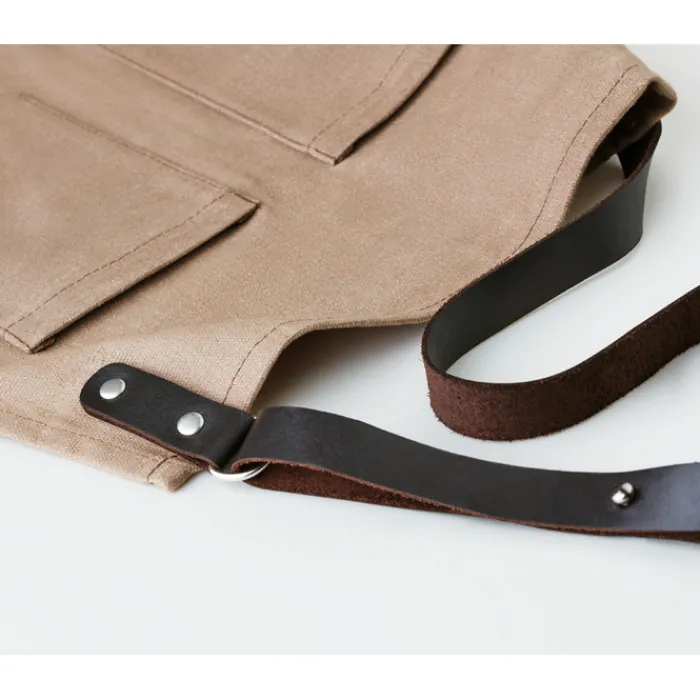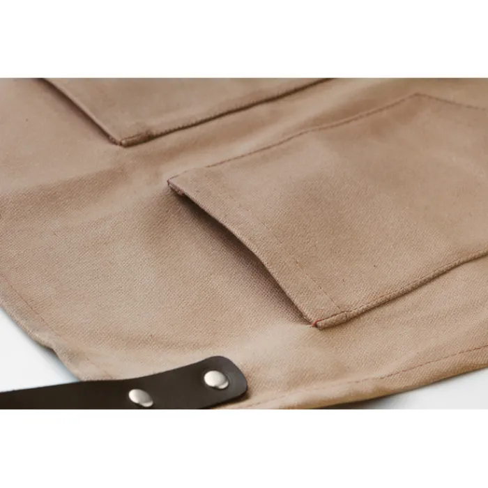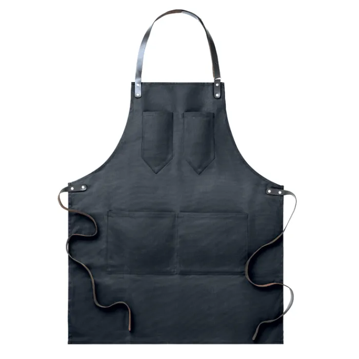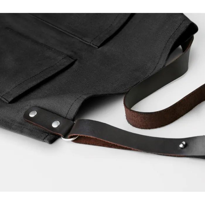 Grembiule regolabile in canvas cerato con dettagli in pelle. 2 tasche sul petto e una più grande sulla pancia.