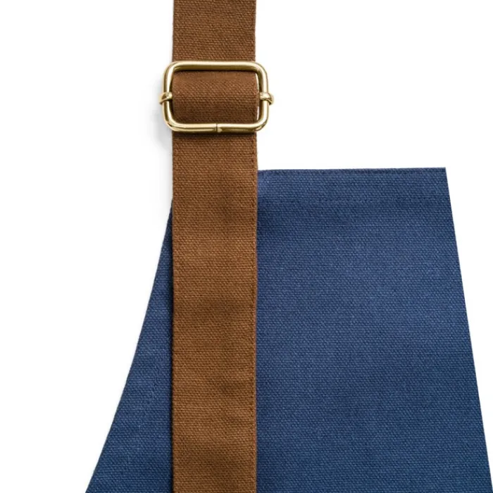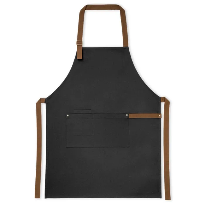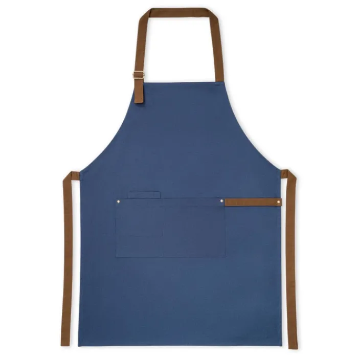 Grembiule in 100% tela di cotone da 300 g/m² con dettagli metallici. Ha 3 tasche e una cinghia laterale, per appendere uno strofinaccio. Tracolla facilmente regolabile. Fornito in una confezione regalo di carta kraft.