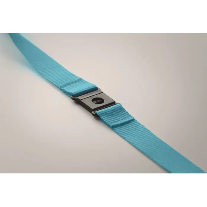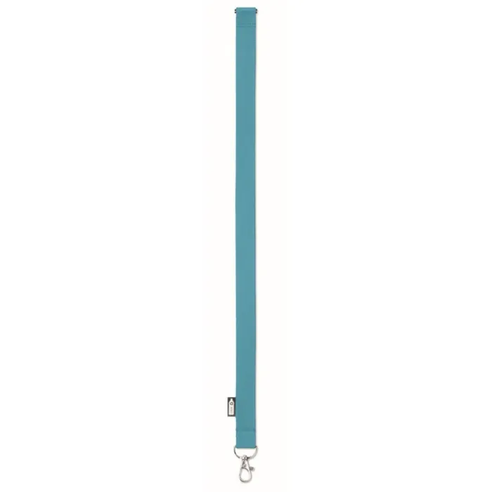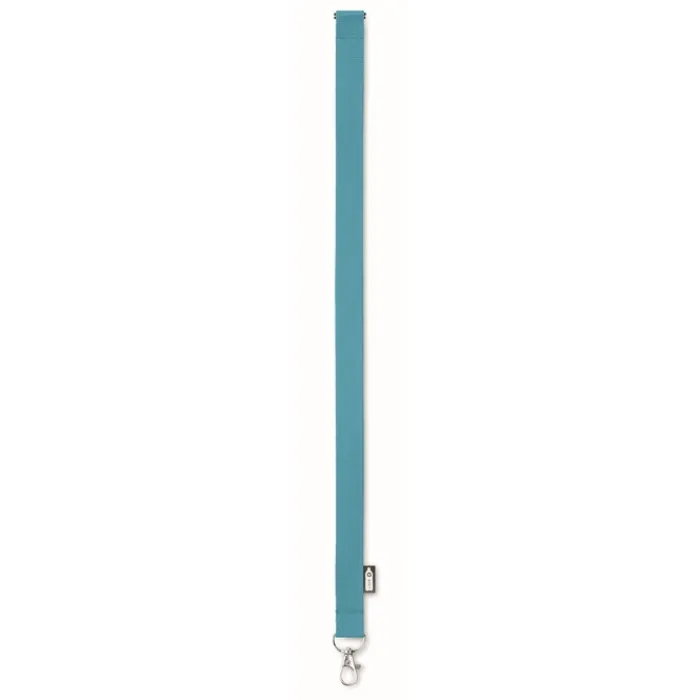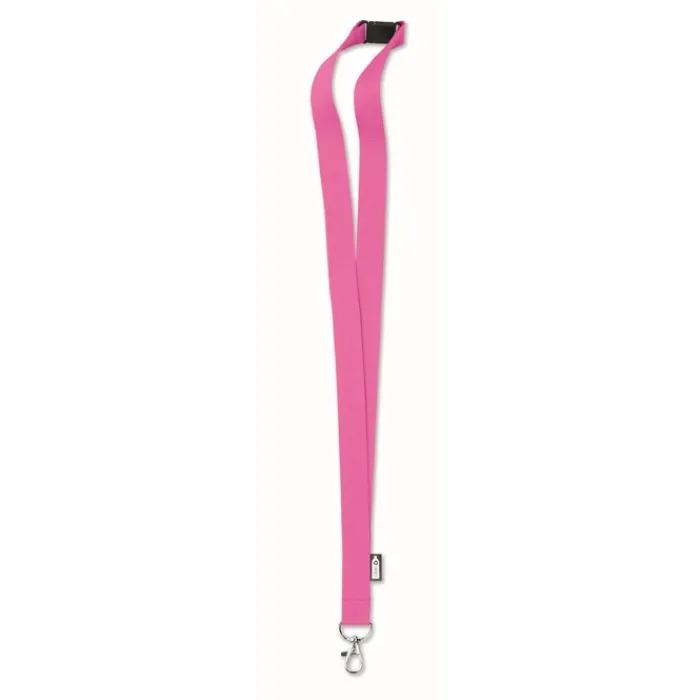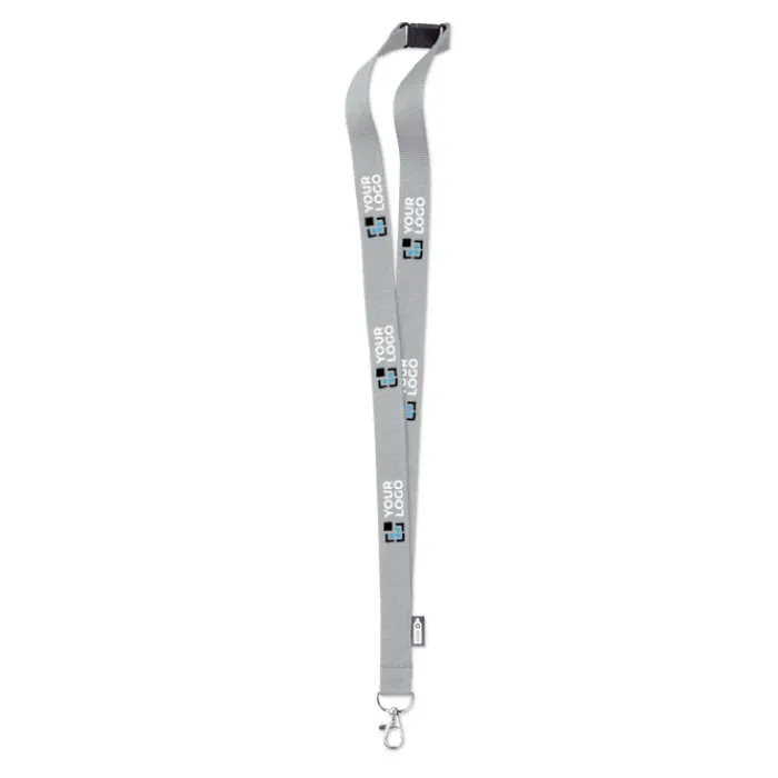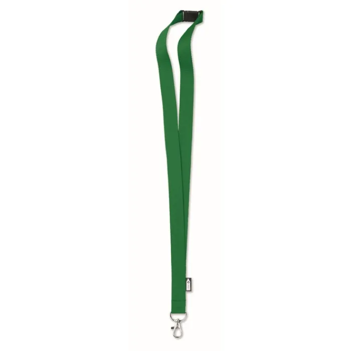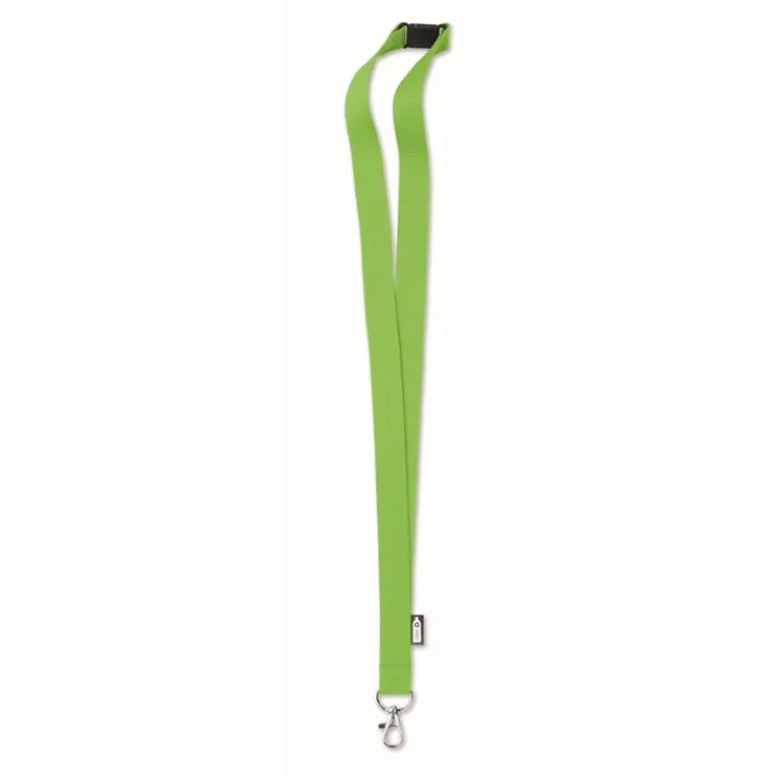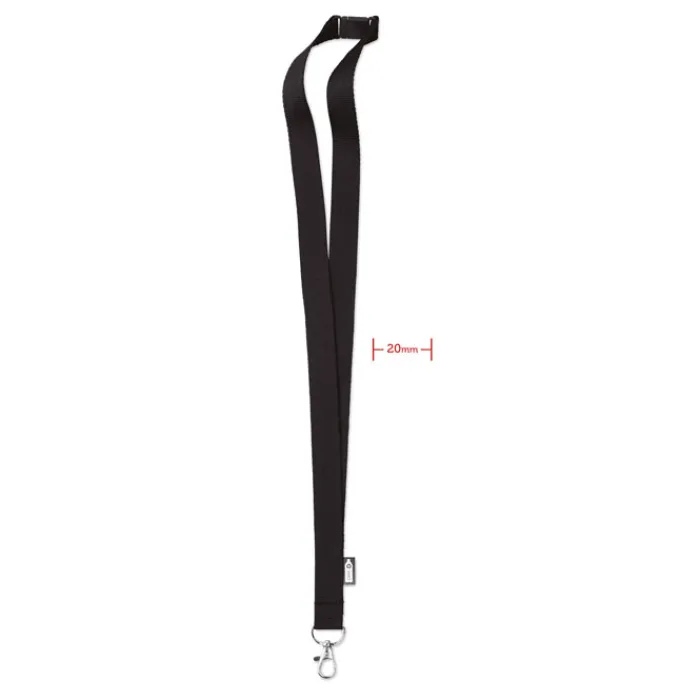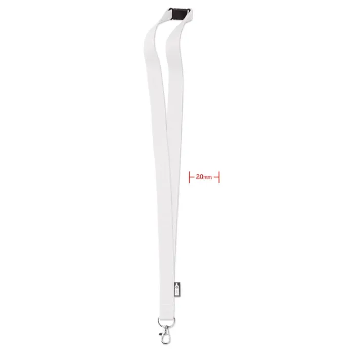 Lanyard in rPET da 20 mm con moschettone metallico e chiusura di sicurezza. Stampa in sublimazione disponibile solo sull’articolo di colore bianco.