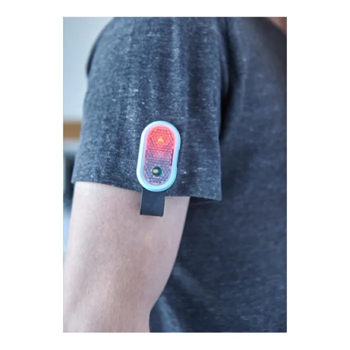 Luce di sicurezza multiuso in ABS con luce a LED COB bianca fissa e rossa lampeggiante. La parte anteriore e quella posteriore sono collegate da un cinturino in silicone ed è presente un magnete per unirle. Funziona con 2 batterie CR1220, che vengono incluse.