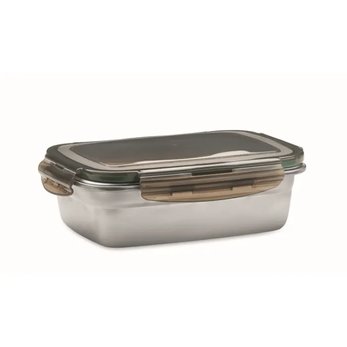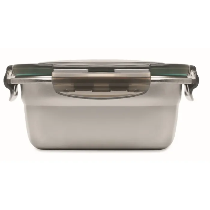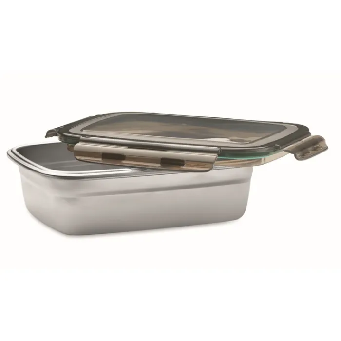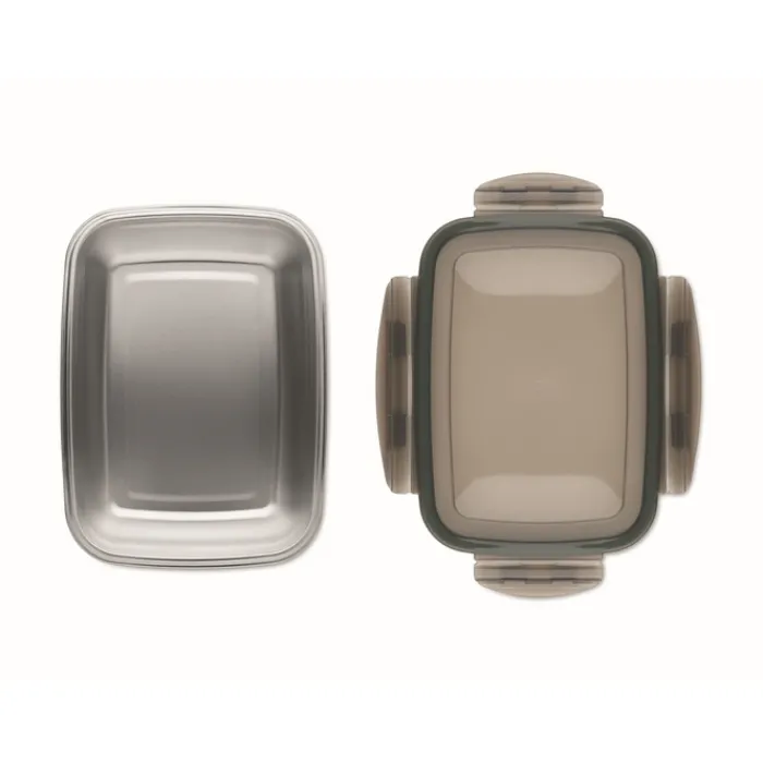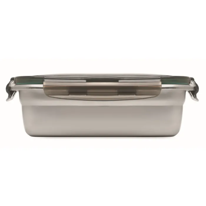 Portavivande in acciaio inox riciclato con coperchio in PP riciclato e 4 chiusure laterali. Capacità: 850 ml.