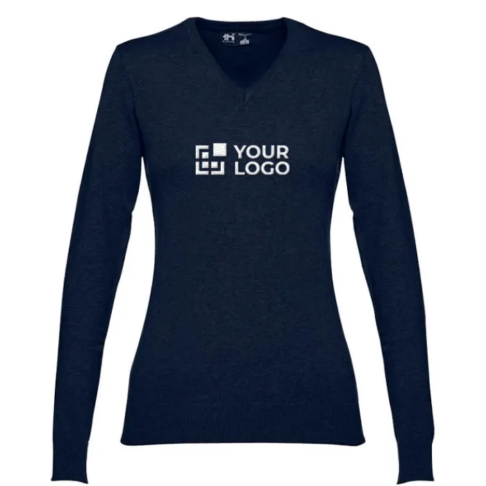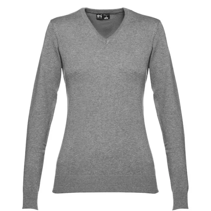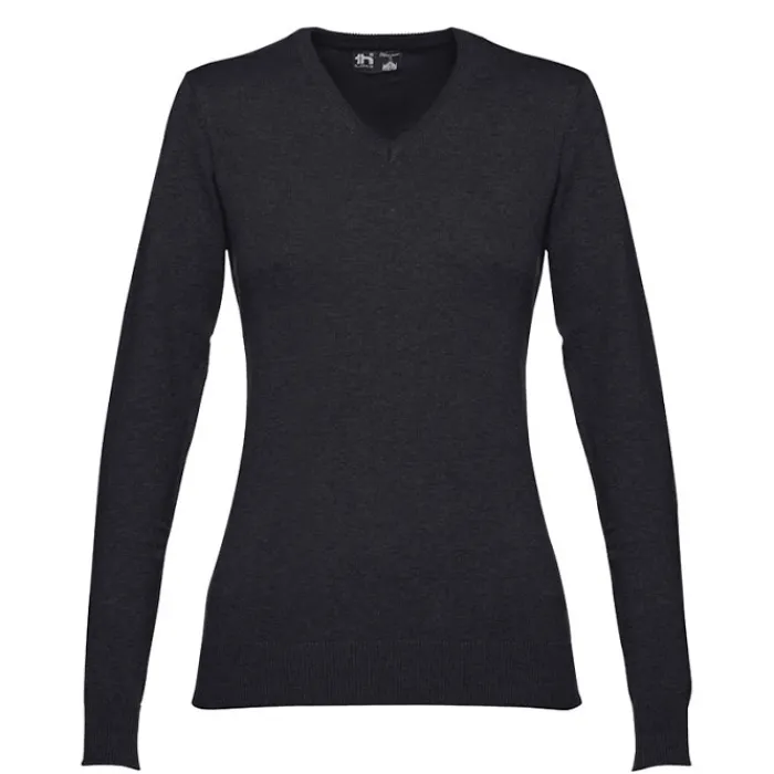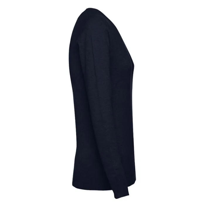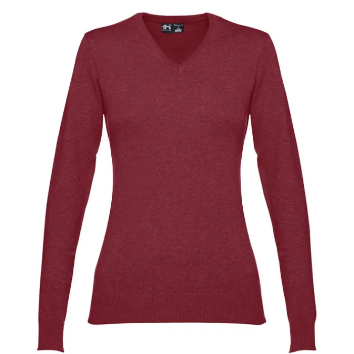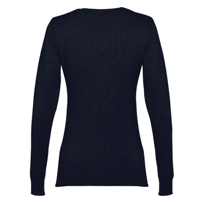 Maglioncino da donna con scollo a “V” realizzato al 70% in cotone e al 30% in poliammide (220 g/m²). Ha polsini, scollo e orlo a costine, con maniche rifinite in “full fashion”.