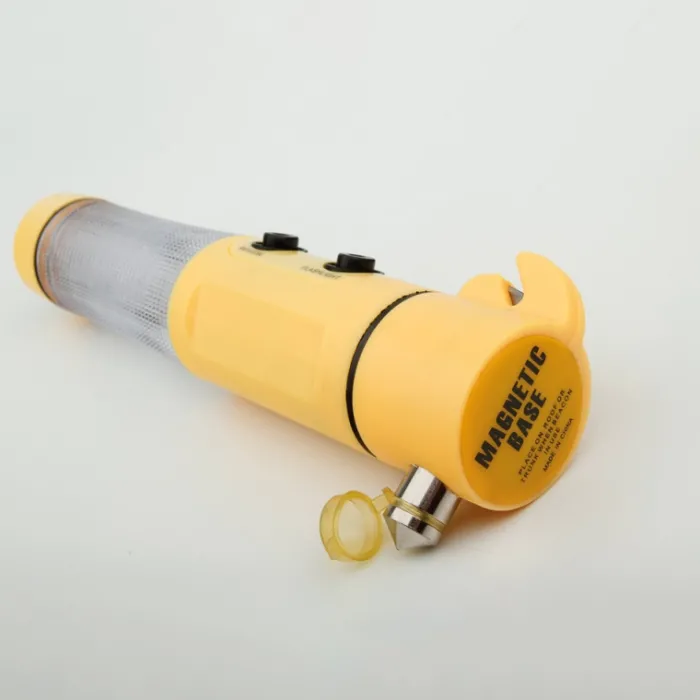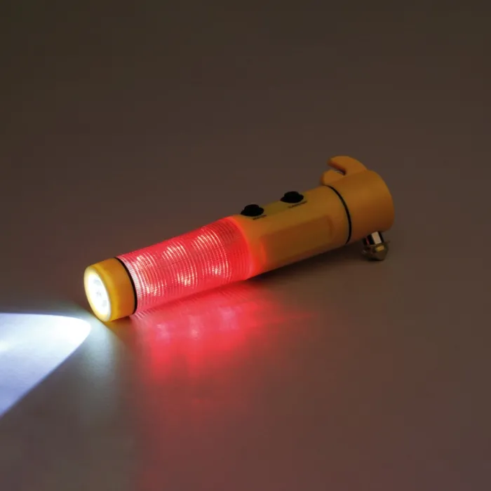 Martello di emergenza con calamita, taglierino per cinture di sicurezza e luce flash con 1 LED e 3 LED rossi. Le batterie AA (2x) sono incluse e il prodotto è fornito in scatola.