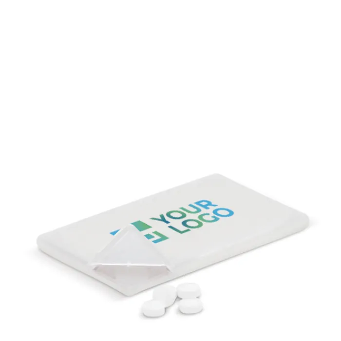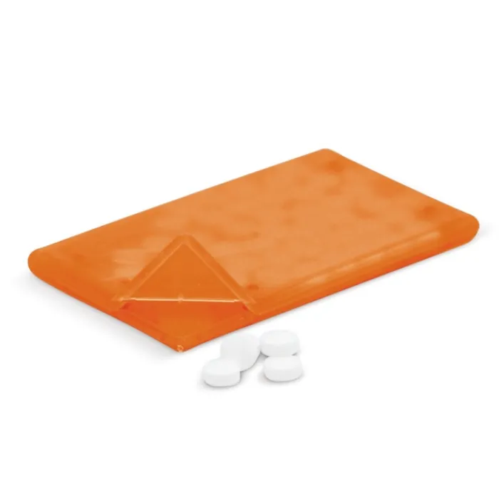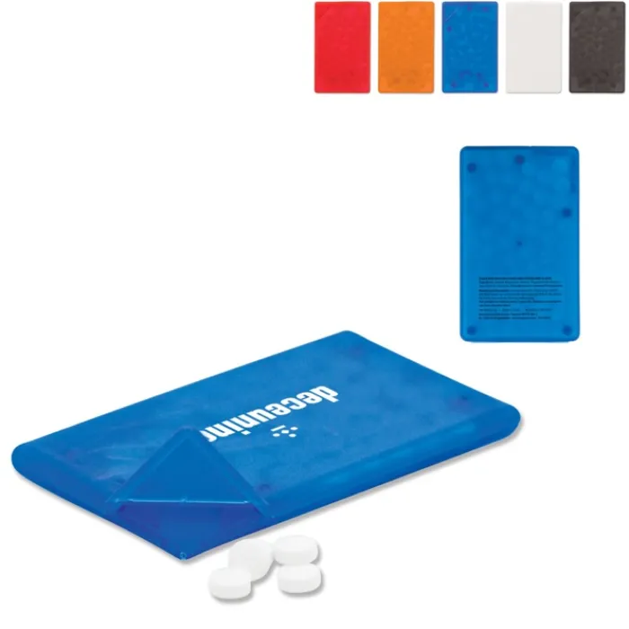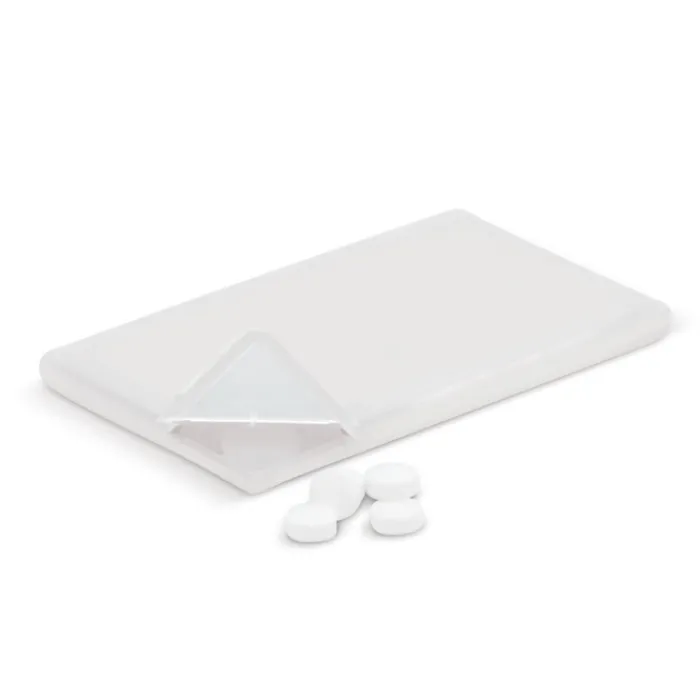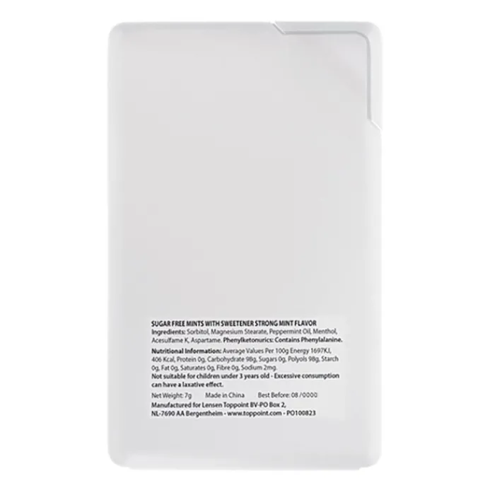 Mentine senza zucchero in scatolina rettangolare di plastica colorata. Apertura in un angolo. Contiene circa 7 grammi. Durata di conservazione di almeno 6 mesi.