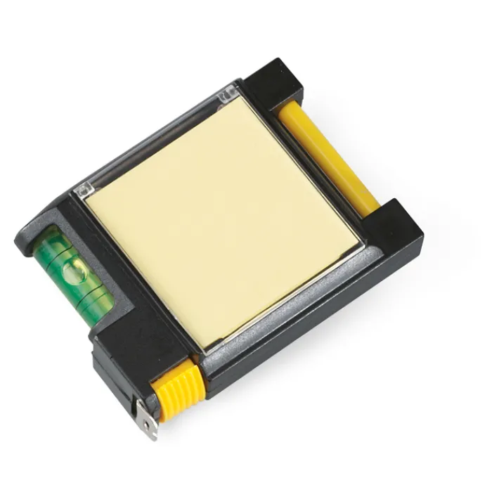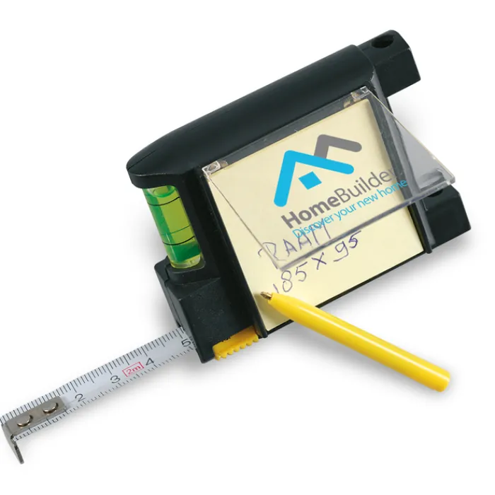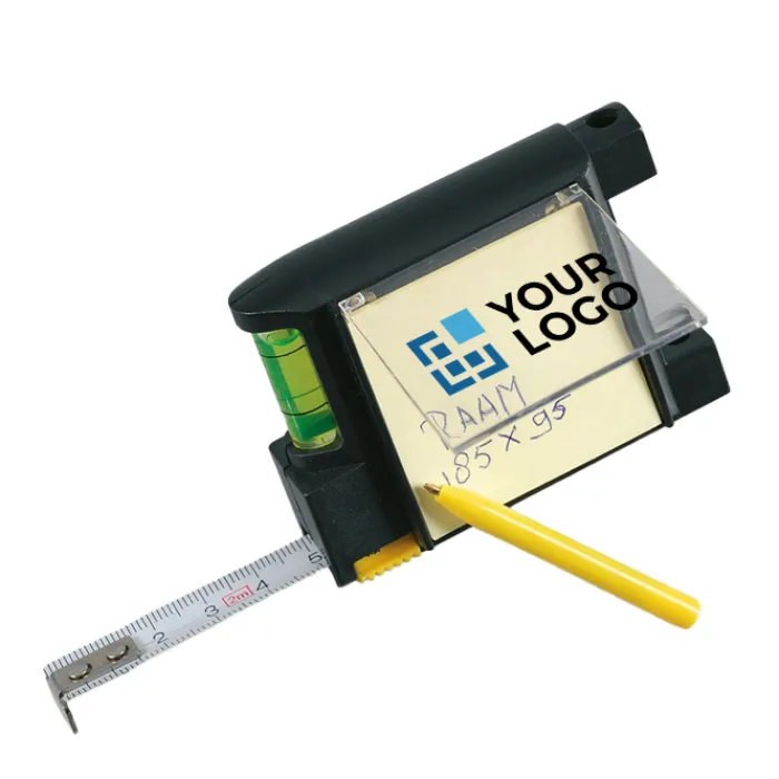 Flessometro (200 cm) con memo pad, penna a sfera e livella.