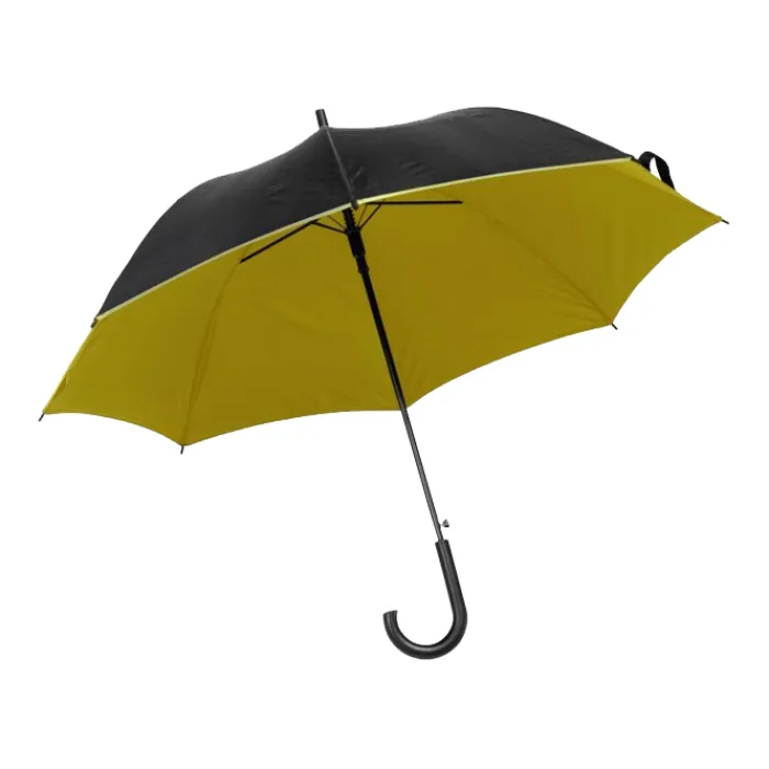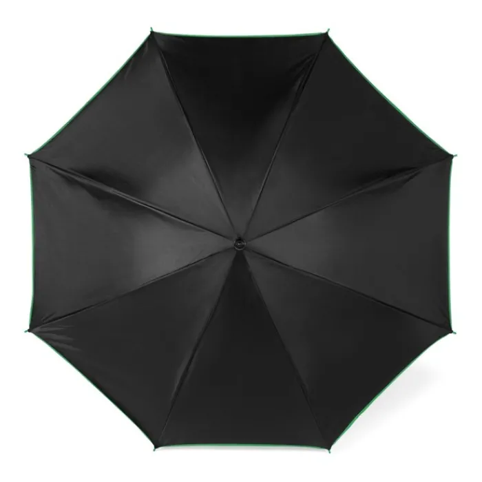 Ombrello automatico a 8 pannelli in poliestere (190T), esterno nero e interno colorato. Manico in plastica, asta e bacchette in metallo, chiusura in velcro.