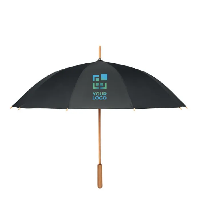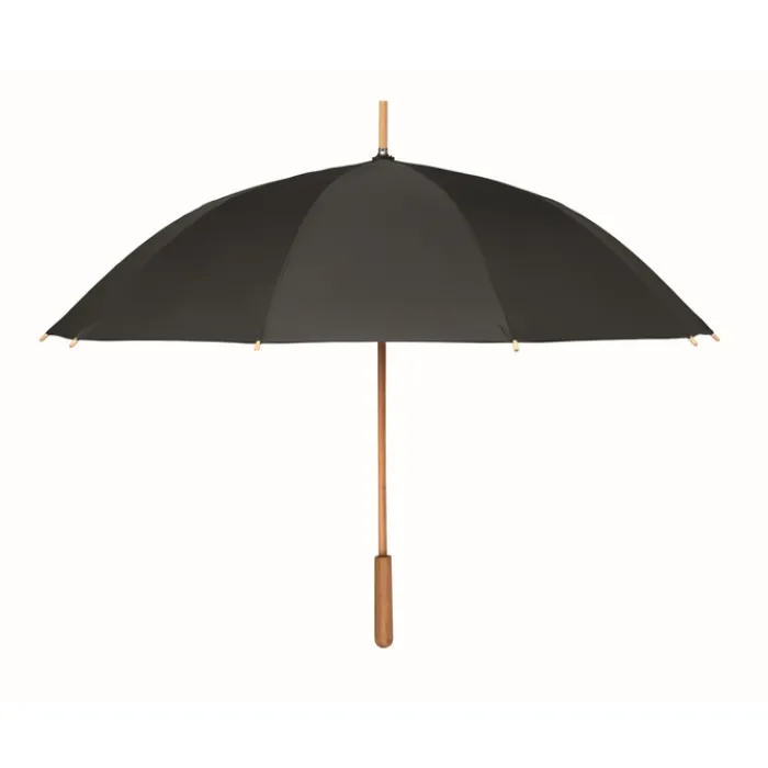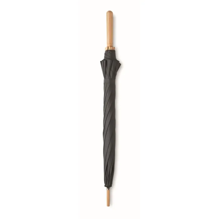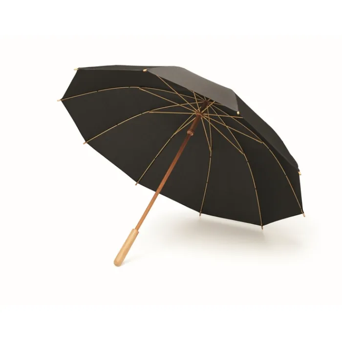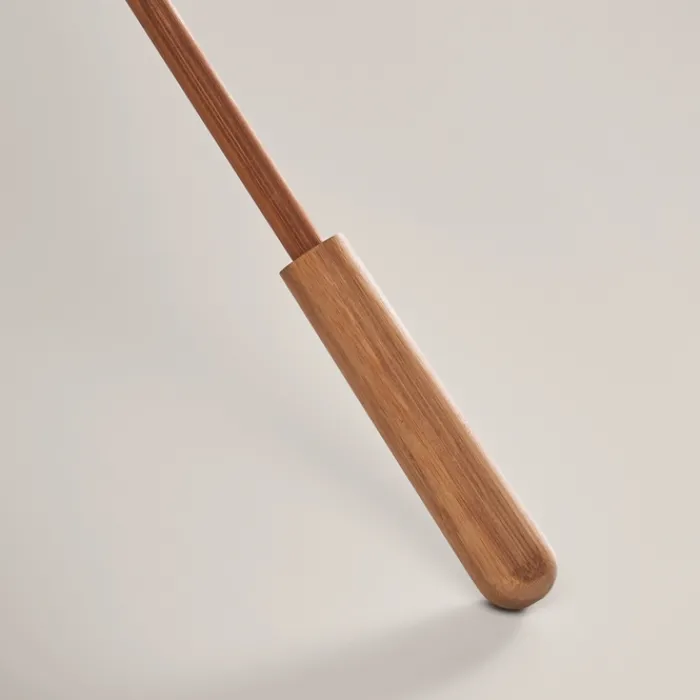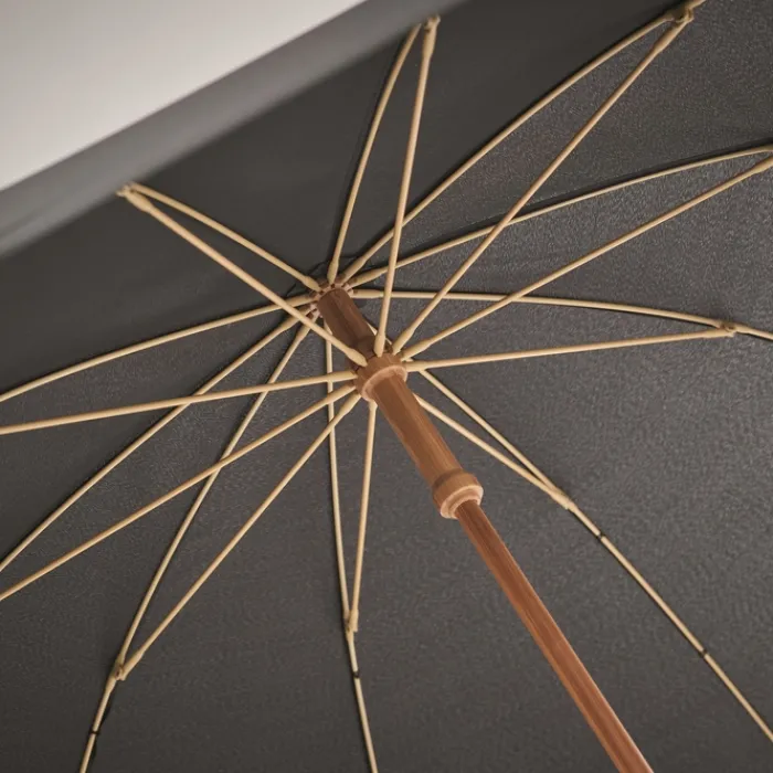Ombrello antivento ad apertura manuale da 23,5 pollici con tela in pongee RPET 190T. Fusto, punta e manico in legno di bambù. Stecche in fibra di vetro di colore naturale. Chiusura manuale. Il bambù è un materiale naturale, per cui il colore potrebbe variare leggermente tra un ombrello e l’altro.