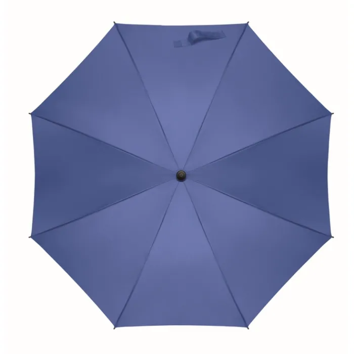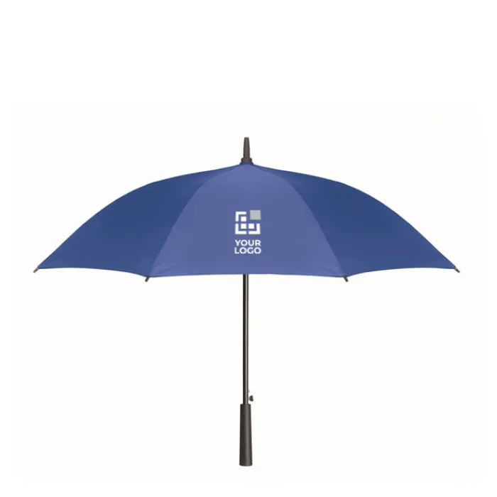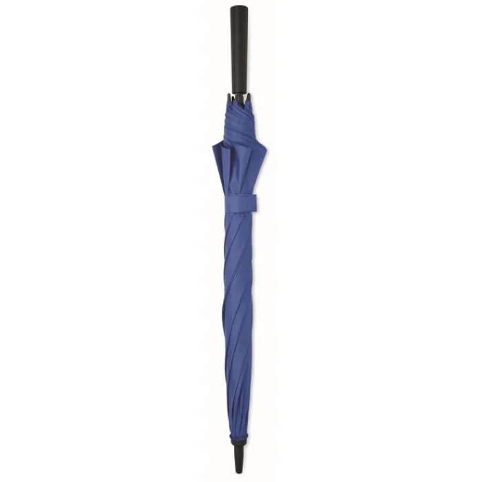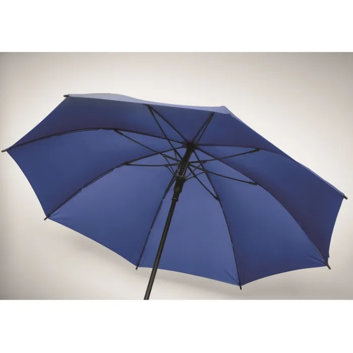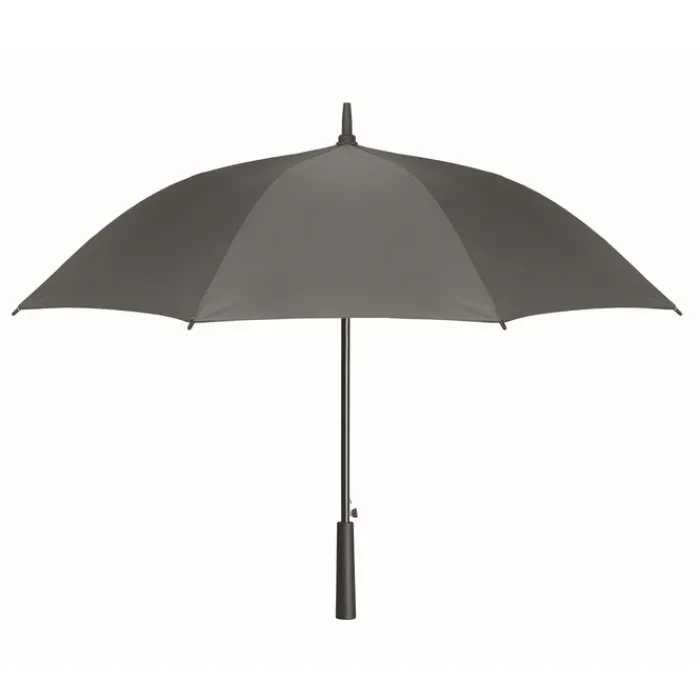 Ombrello antivento ad apertura automatica da 23 pollici con tela in poliestere 190T. Struttura in fibra di vetro, fusto cromato e punte in plastica. Manico in ABS con finitura in gomma. Chiusura manuale.
