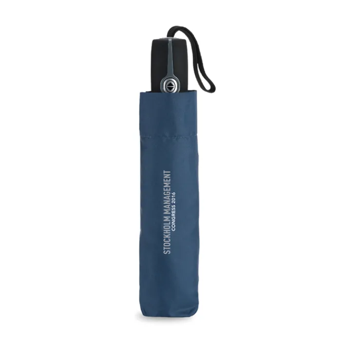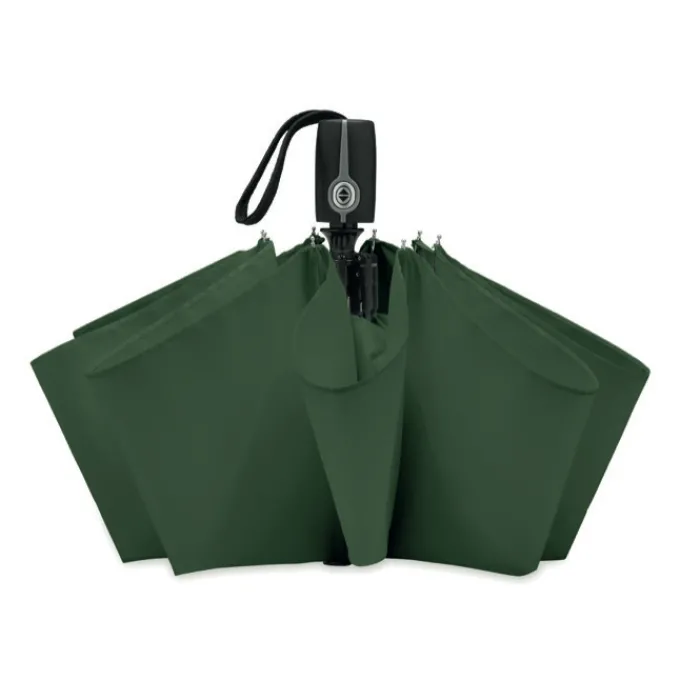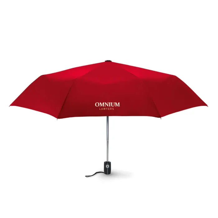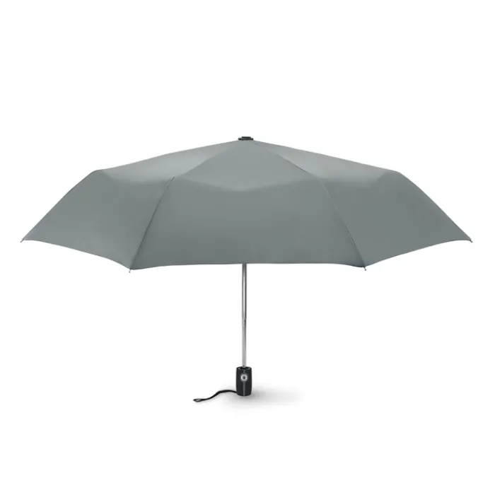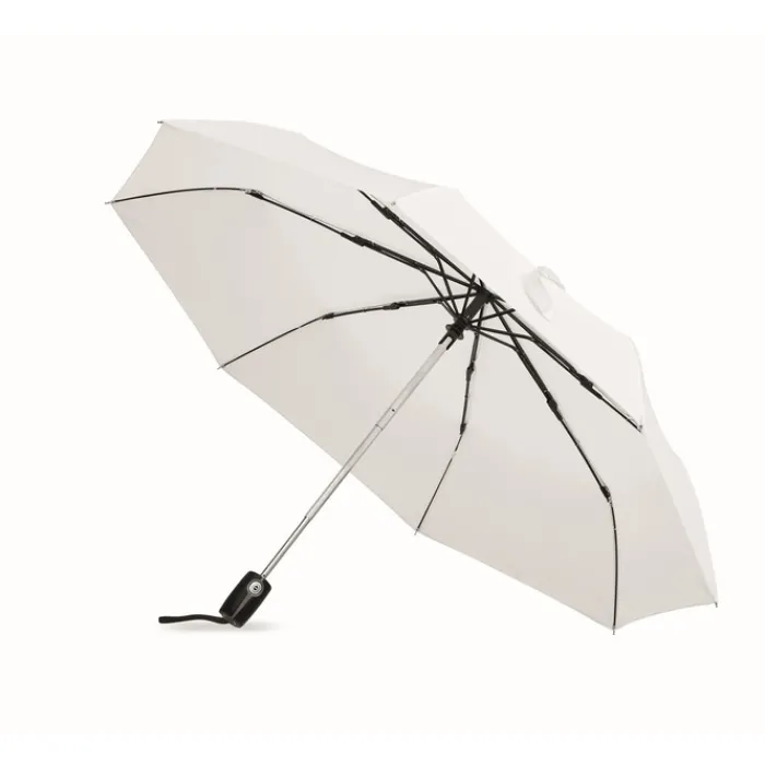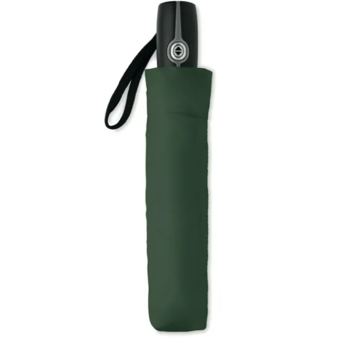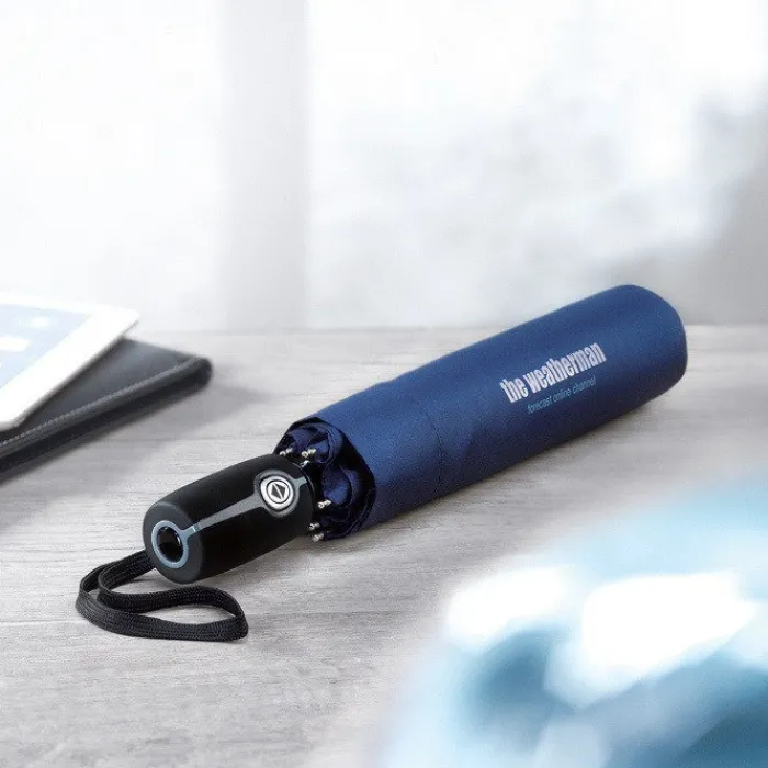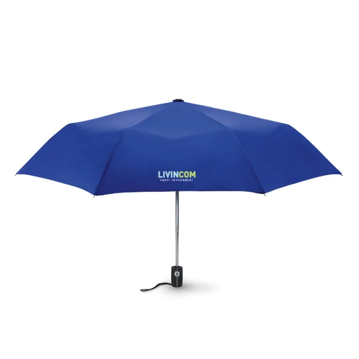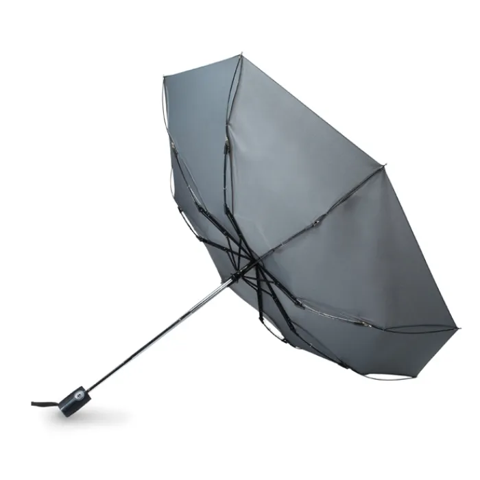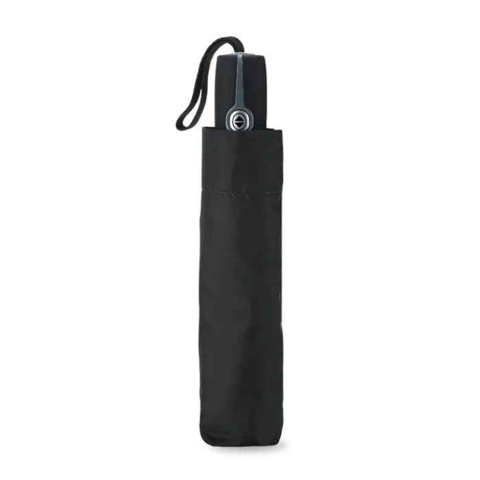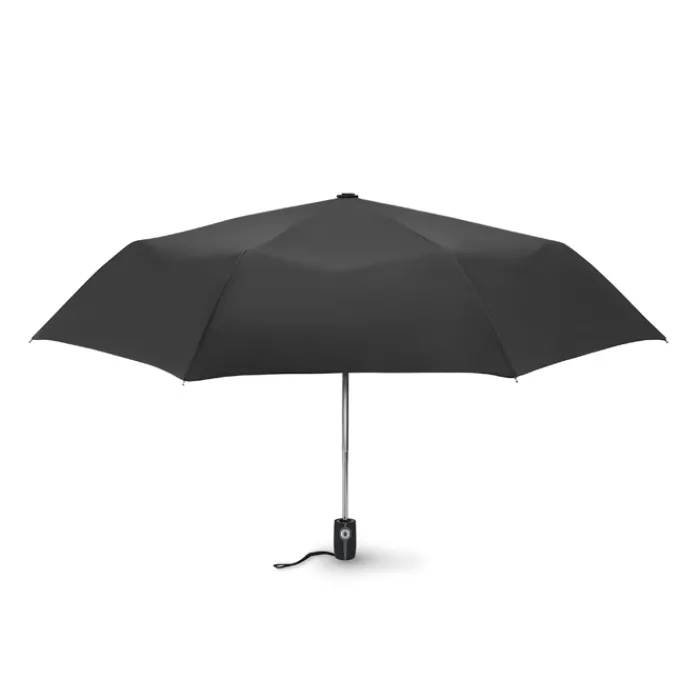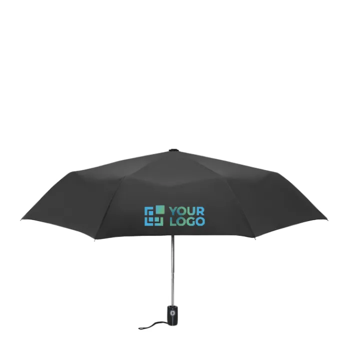 Ombrello automatico pieghevole da 21″ in 190T con custodia. Struttura in acciaio placcata in zinco. Nervature nere con due sezione in fibra di vetro e punte in metallo cromato. Manico nero.